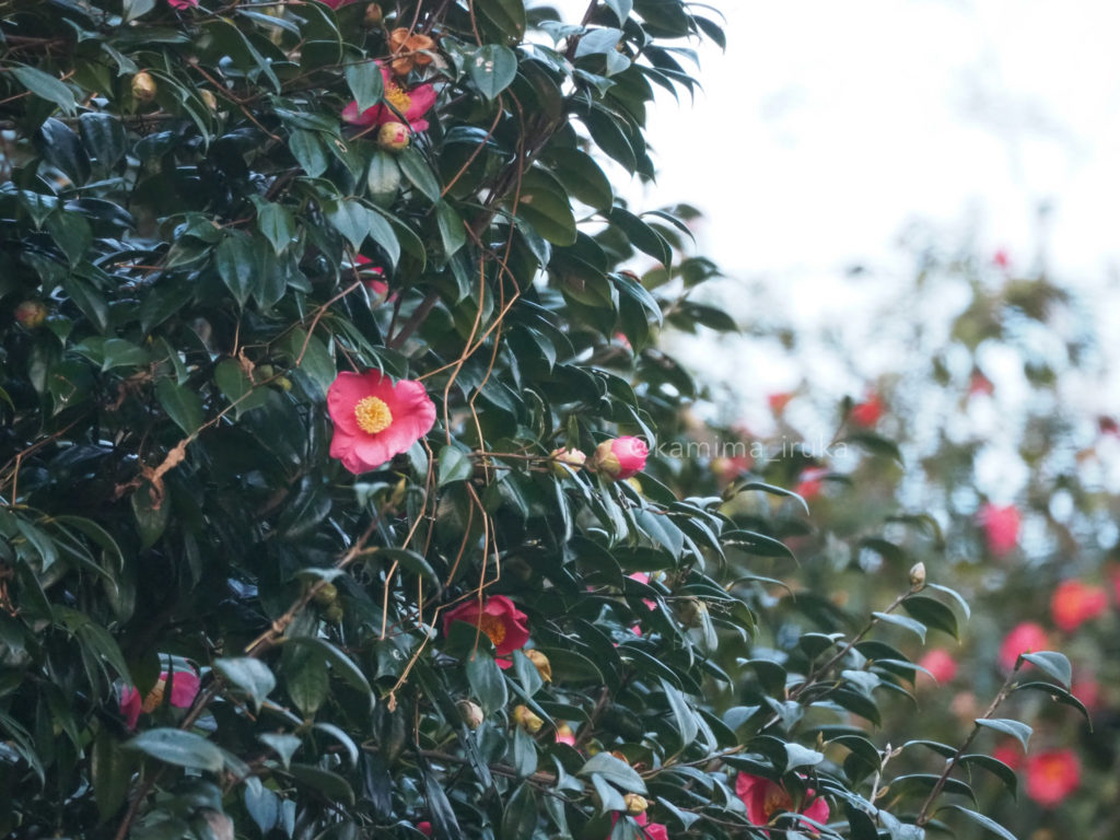 遠くのほうに見える、この鮮やかな色は山茶花か…あるいは、藪椿。