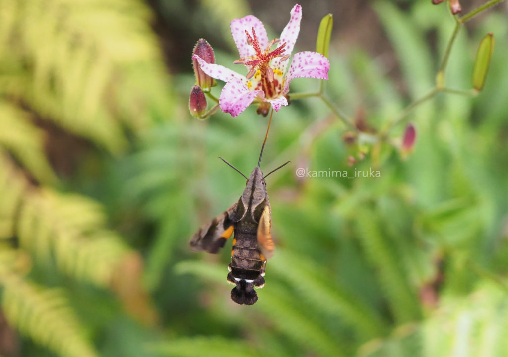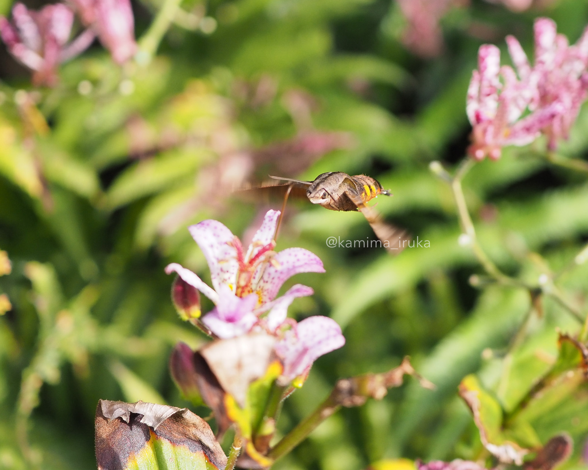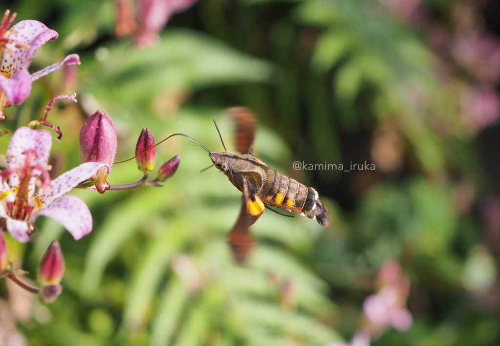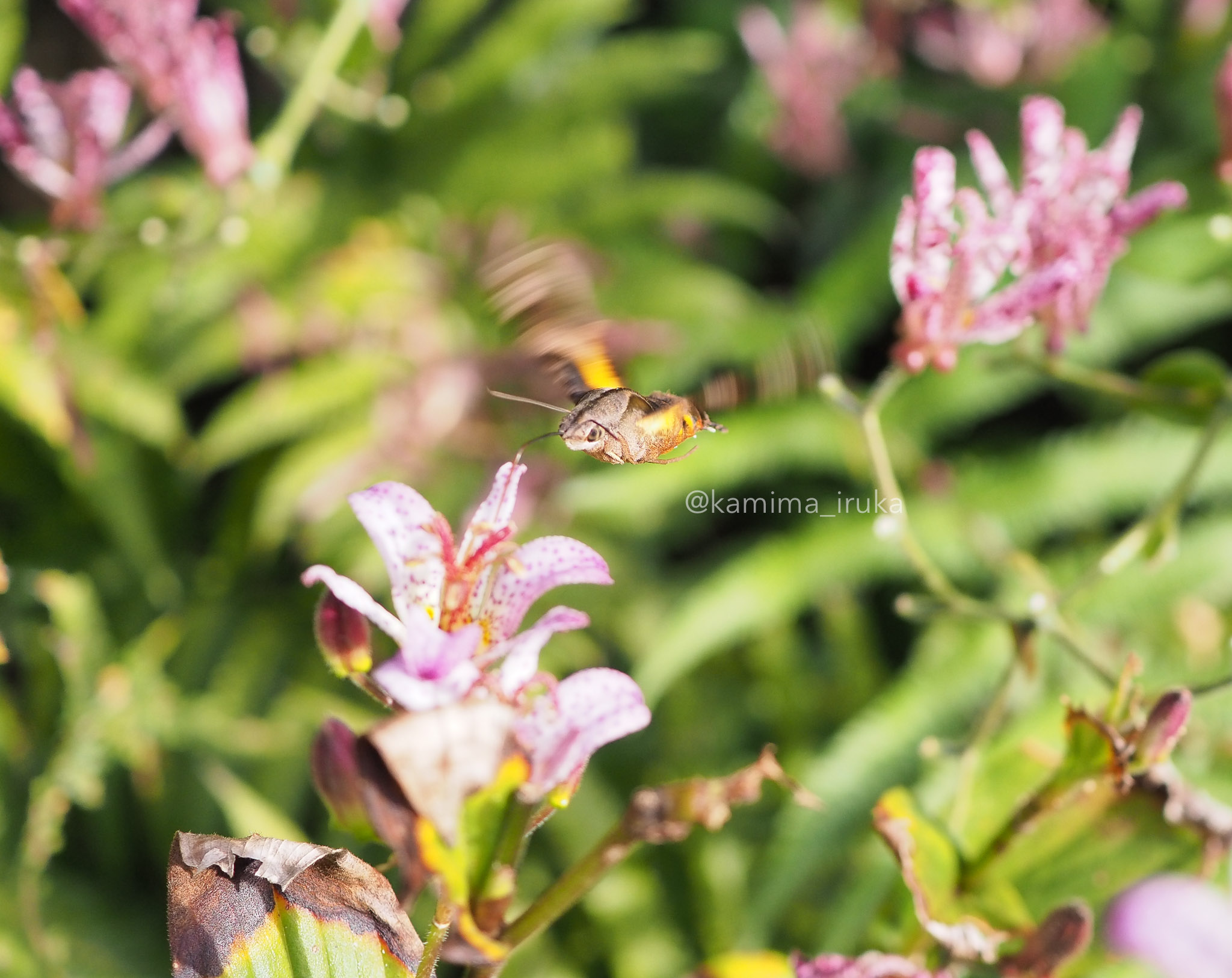 ホシホウジャクは脚を花にふれさせずに、完全にホバリングしながら蜜を吸います。
