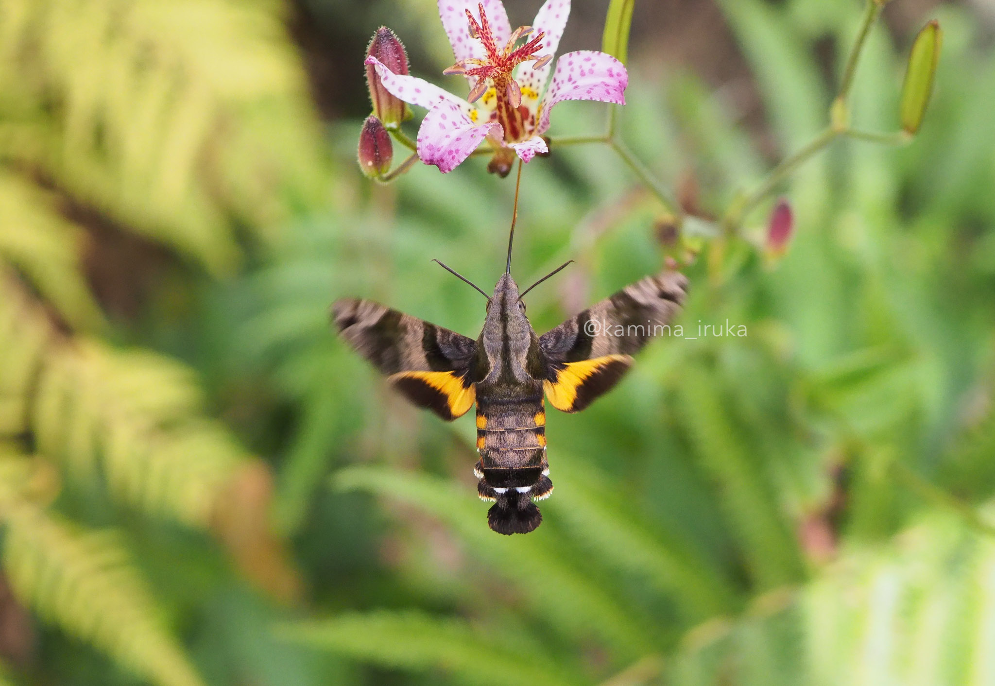 おなじスズメガの仲間のオオスカシバは、前脚(つい「おてて」と呼んでしまう)を花にかけて吸蜜するのがかわいいです。