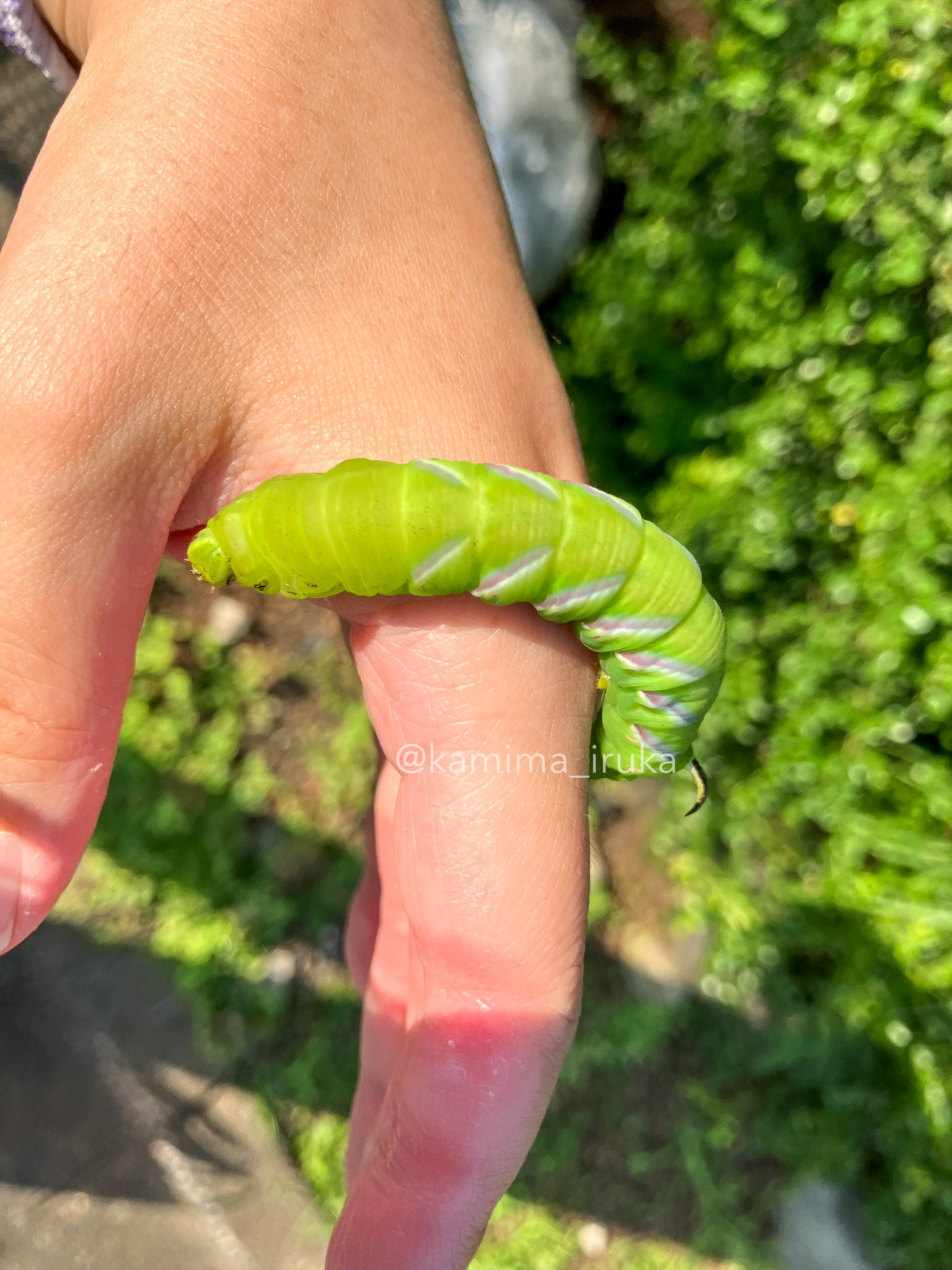 kamima_iruka 2024-07-05 ウォーキングしてからのコンビニ帰りに、道路でよちよち歩いていたイモムシちゃんを見つけたので、植木に乗せておきました。メンガタスズメのお子さんかな…?むっちむっちぽよぽよのボディと、ピンと立った尾角がカワイイネエ… ← 2024/07/04 あささんぽ 2024/07/06 あささんぽ →