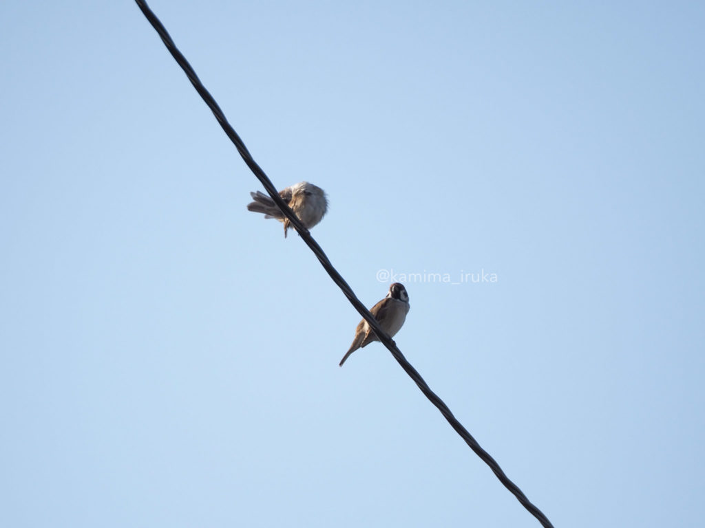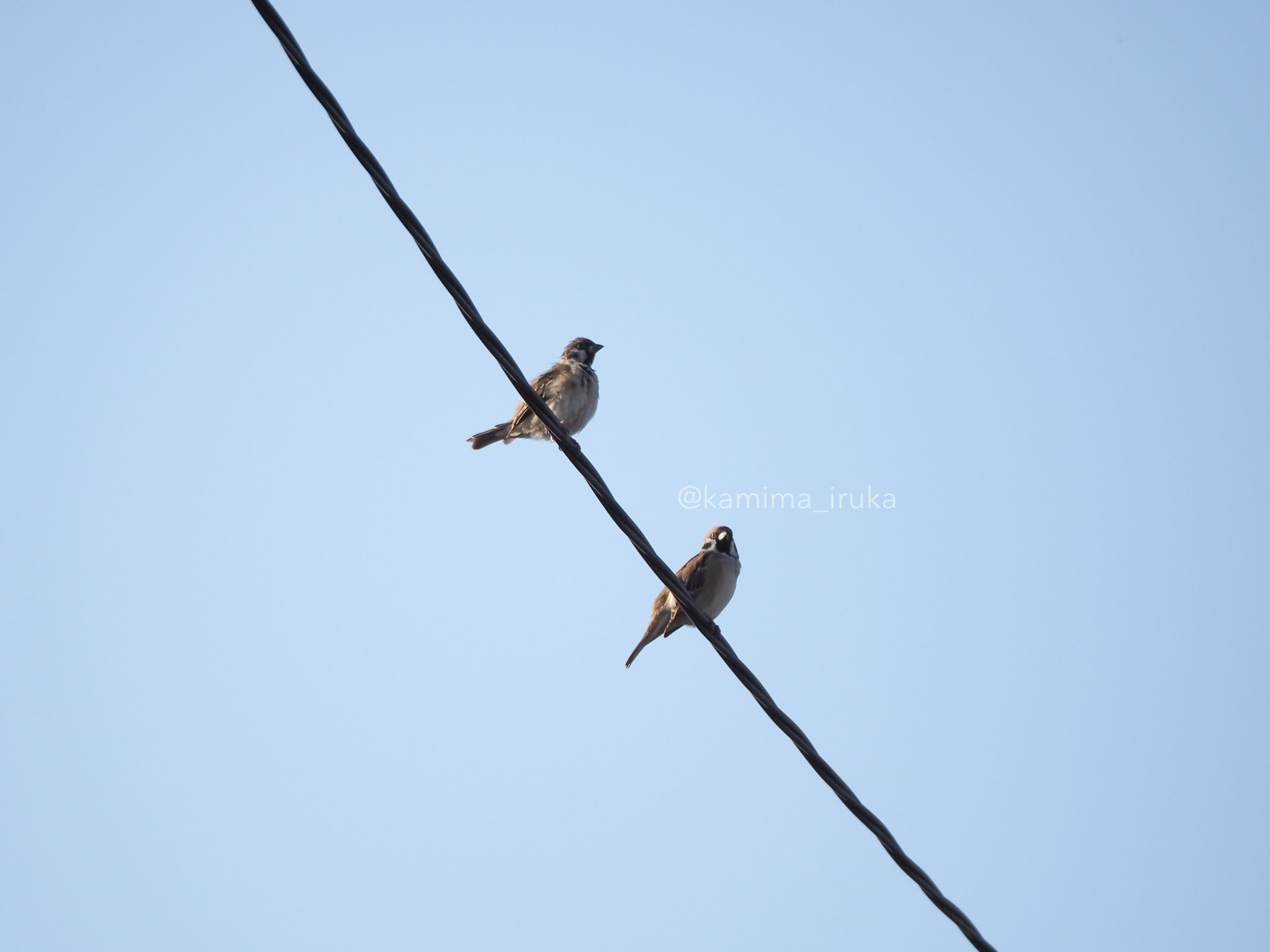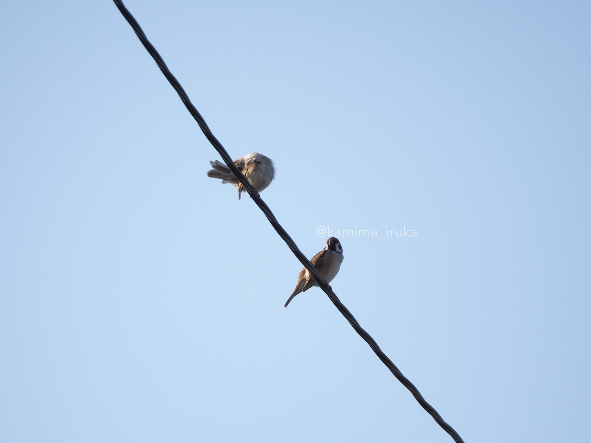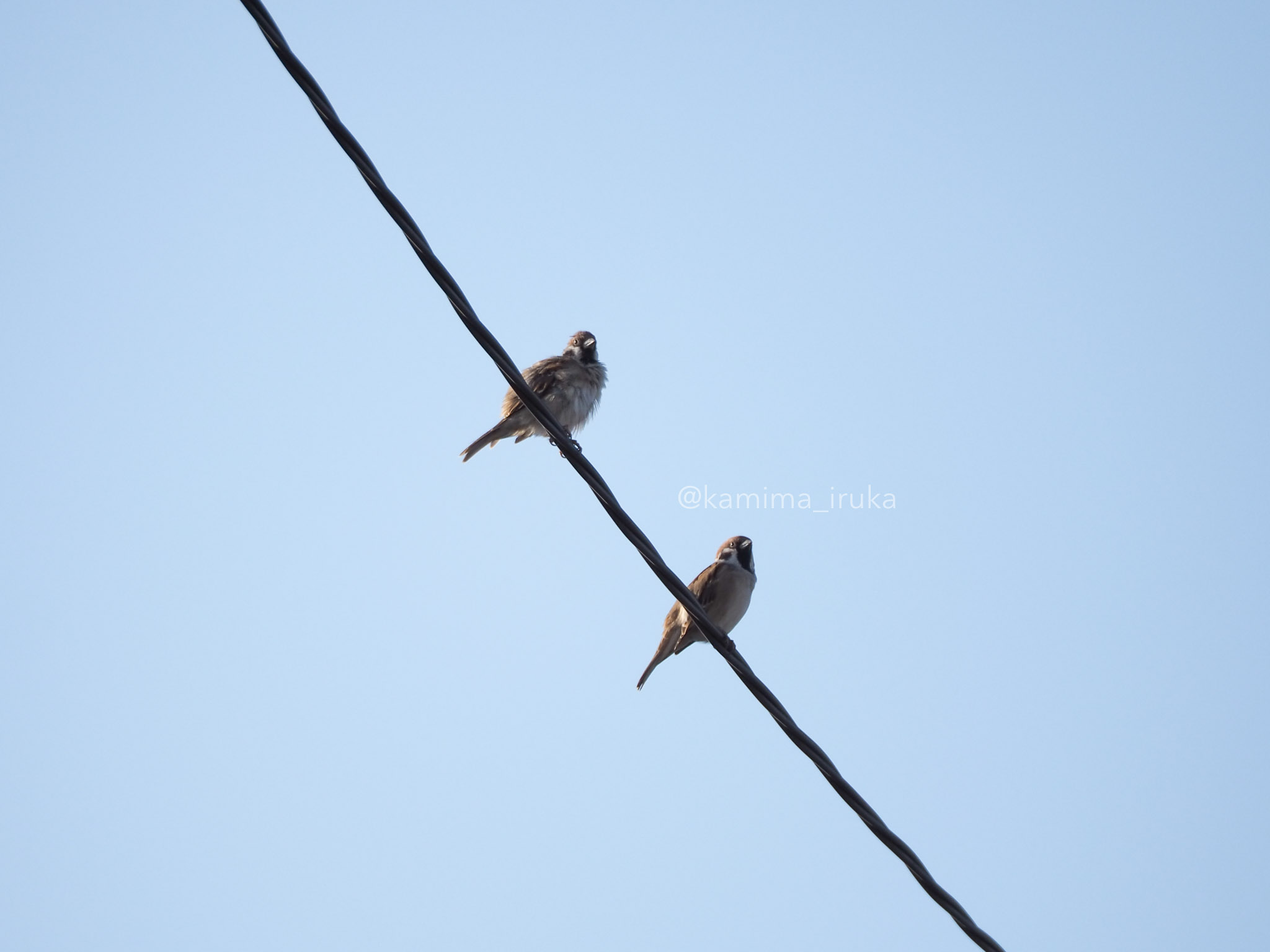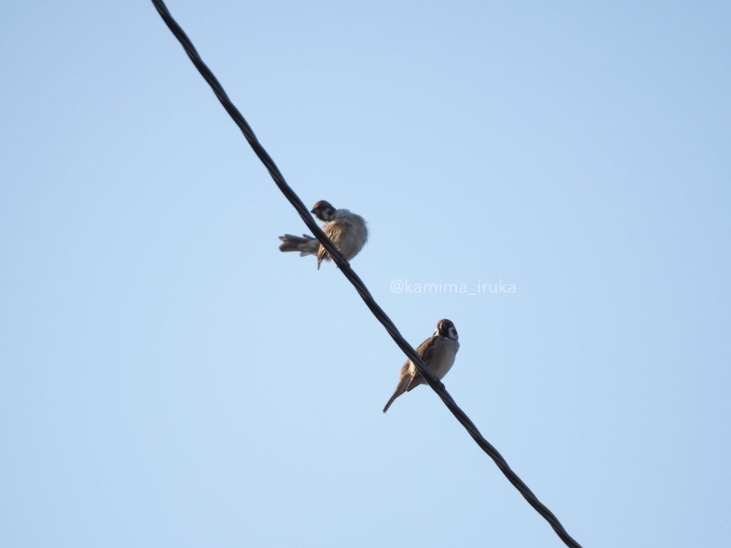 kamima_iruka 2023-11-03 寒い時期にも、あかるく色鮮やかな花や実を見つけると、ちょっと元気が出ますね。 これは、羽繕いしてボッフォ…となったところをニンゲンに目撃されてしまったチュン氏。 ← 2023/11/01 あささんぽ ホトトギスの花の蜜を吸うホシホウジャク →