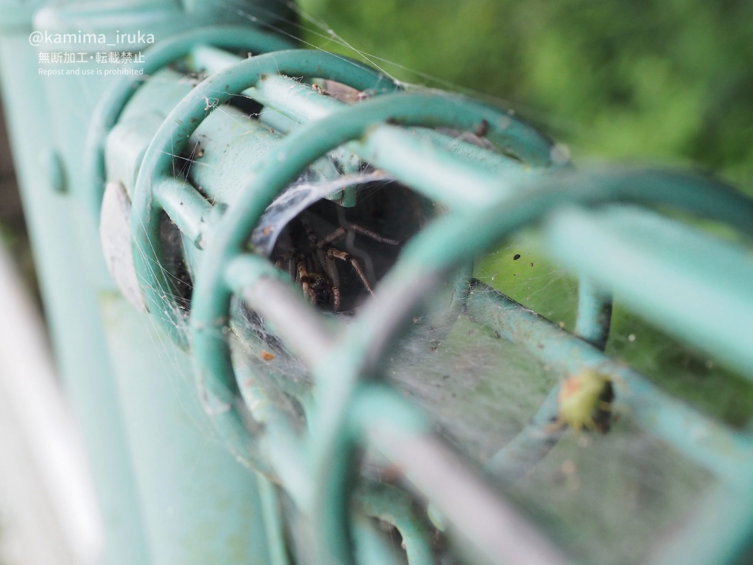 用水路の手すりをうまく利用して住居にしている蜘蛛氏を見つけました。
