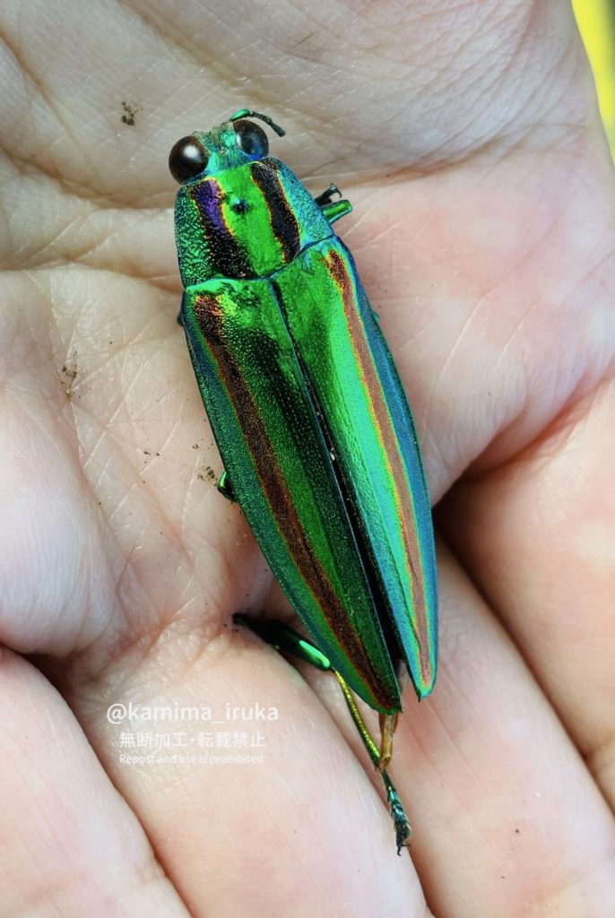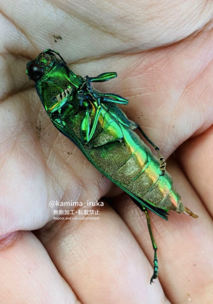 kamima_iruka 2024-08-14 ウォーキング後の休憩中、足元に何かピカピカ光るものが落ちてるなー?と思ったら、タマムシ(のきれいな死骸)でした✨ピカピカ構造色! タマムシ(死骸)をピカピカするだけの動画。脚が1本もげてしまってゴメン…と思いつつも、お腹側も見せてもらいました。メタリックなグリーンの上に、さまざまな色が重なって見えますね。構造色…不思議だな〜…✨ ← 2024/08/13 あささんぽ 2024/08/17 あささんぽ →