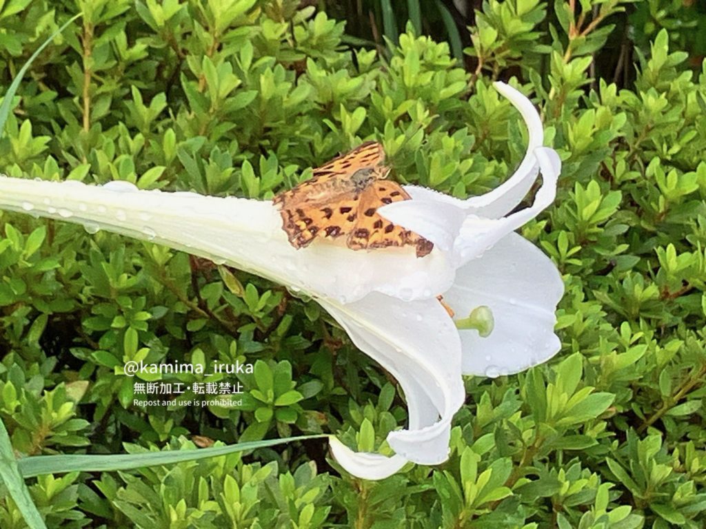 kamima_iruka 2024-09-10 早朝に雨がふり、湿度が高かったのでカメラを持たずにウォーキング。そのためスマホ撮りで画質が悪いですが…。 チャバネセセリの幼虫・テッポウユリにとまるキタテハ・ドヨウオニグモ…かな? ← 2024/09/07 あささんぽ 2024/09/15 あささんぽ →