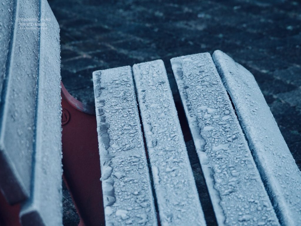 公園のベンチの結露がそのまんま凍り付いたのか、おもしろいことになっておりました。