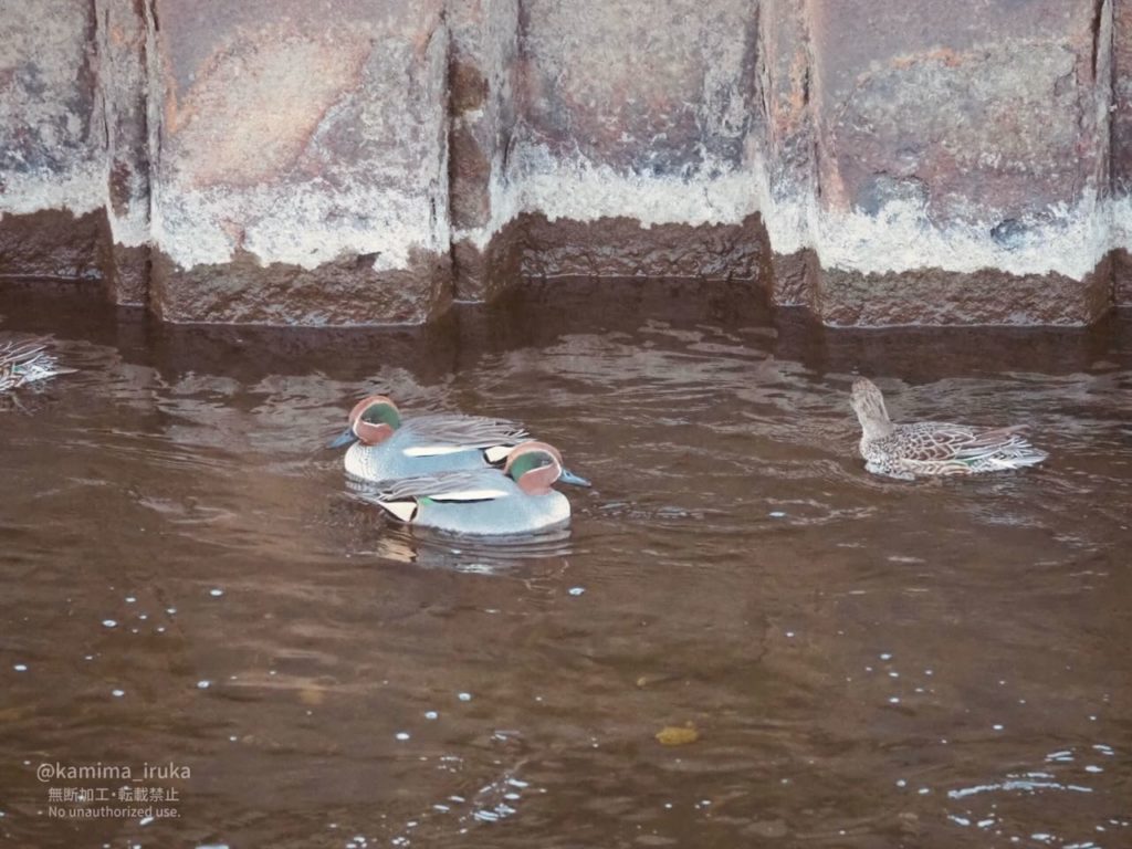 川でみかけたコガモのみんなたち。♂♀それぞれ2羽で、計4羽のちいさなグループ。流れに逆らいながら水に頭をつっこんで採餌中でした。遠目に見ても、カルガモより小さく感じますね。