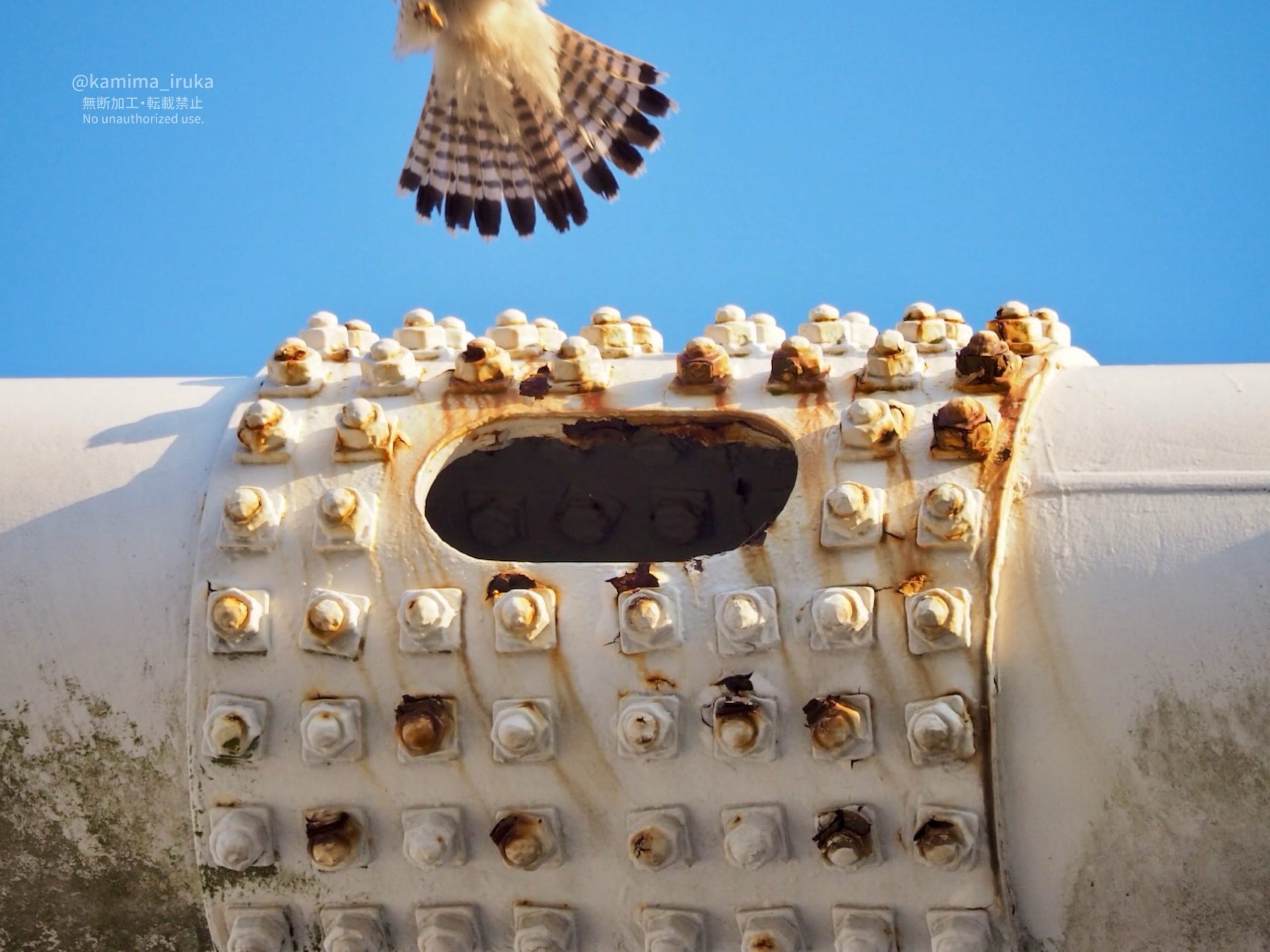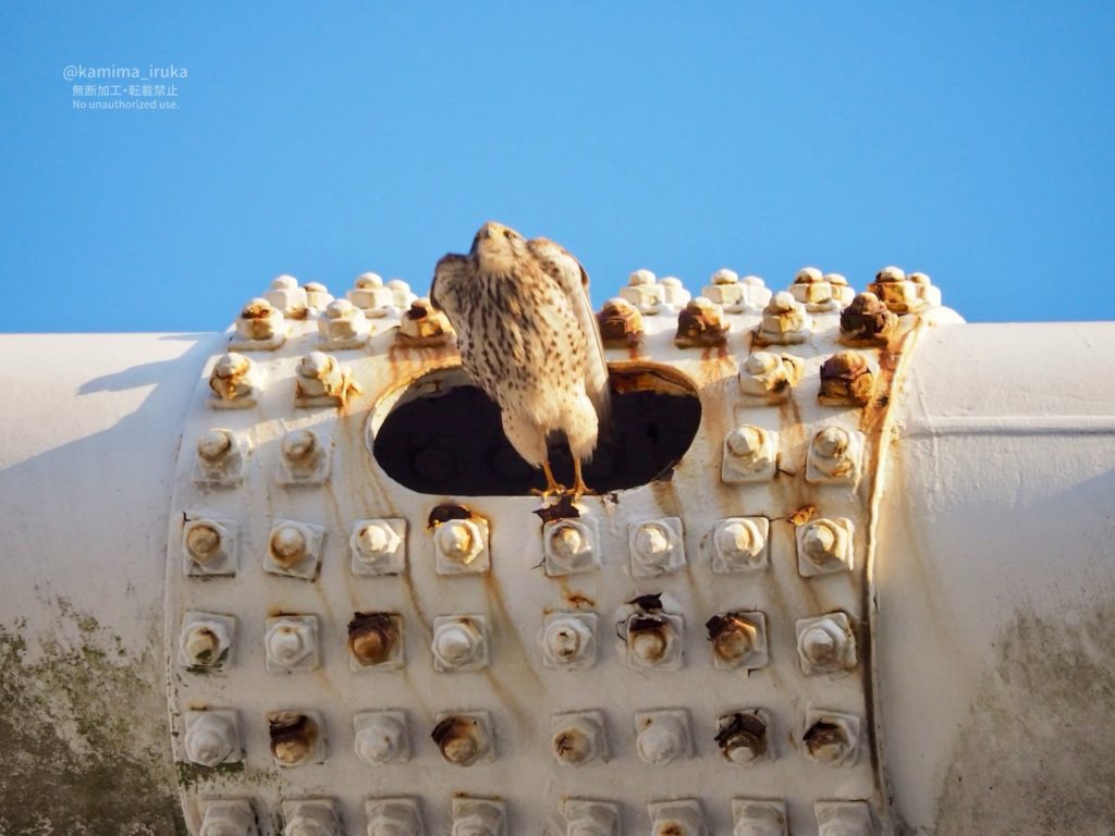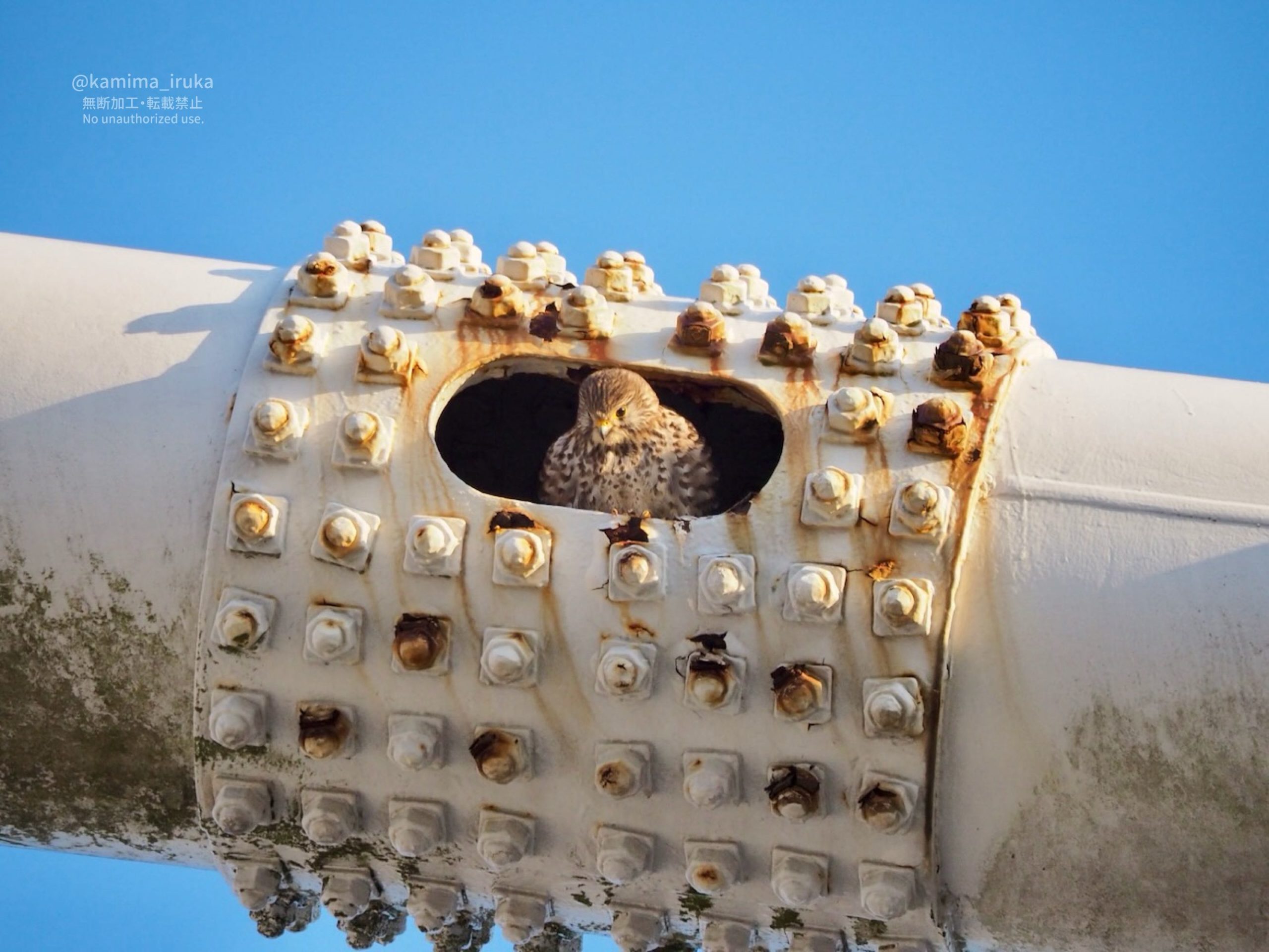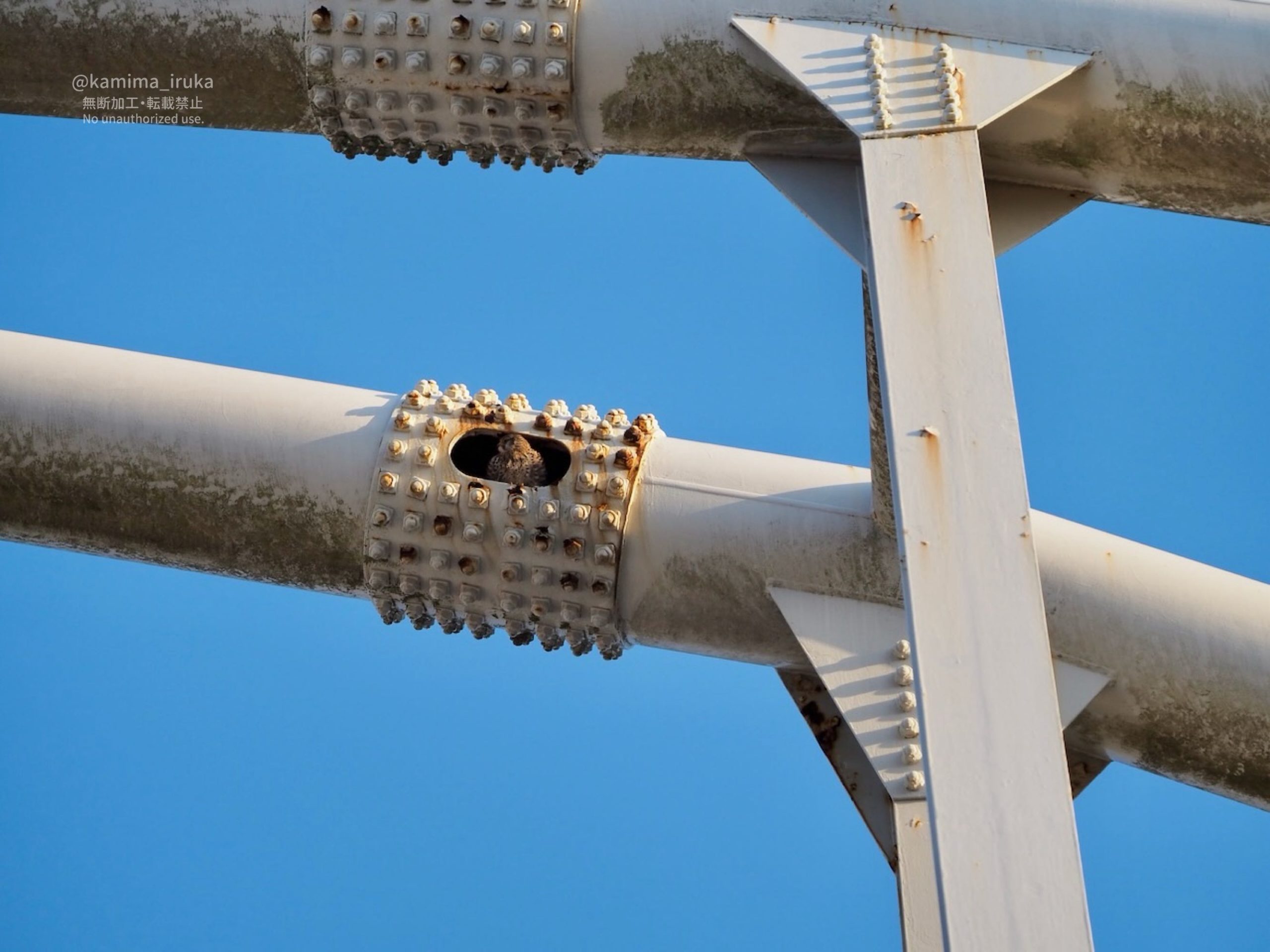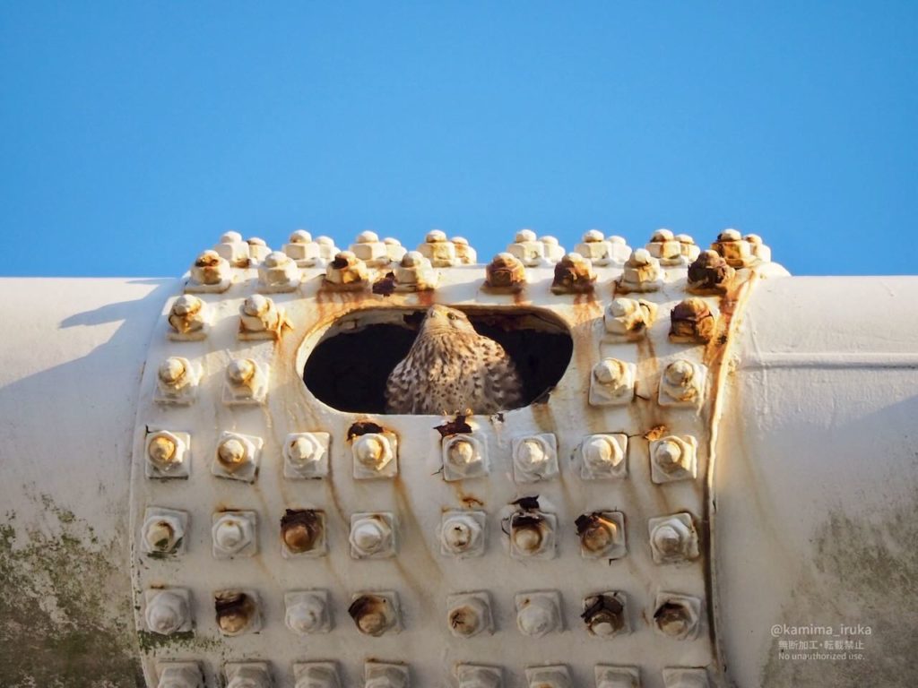 カラスが去ったあとを見ていると、水道橋の柱の穴からヒョッコリ顔を出した猛禽類…