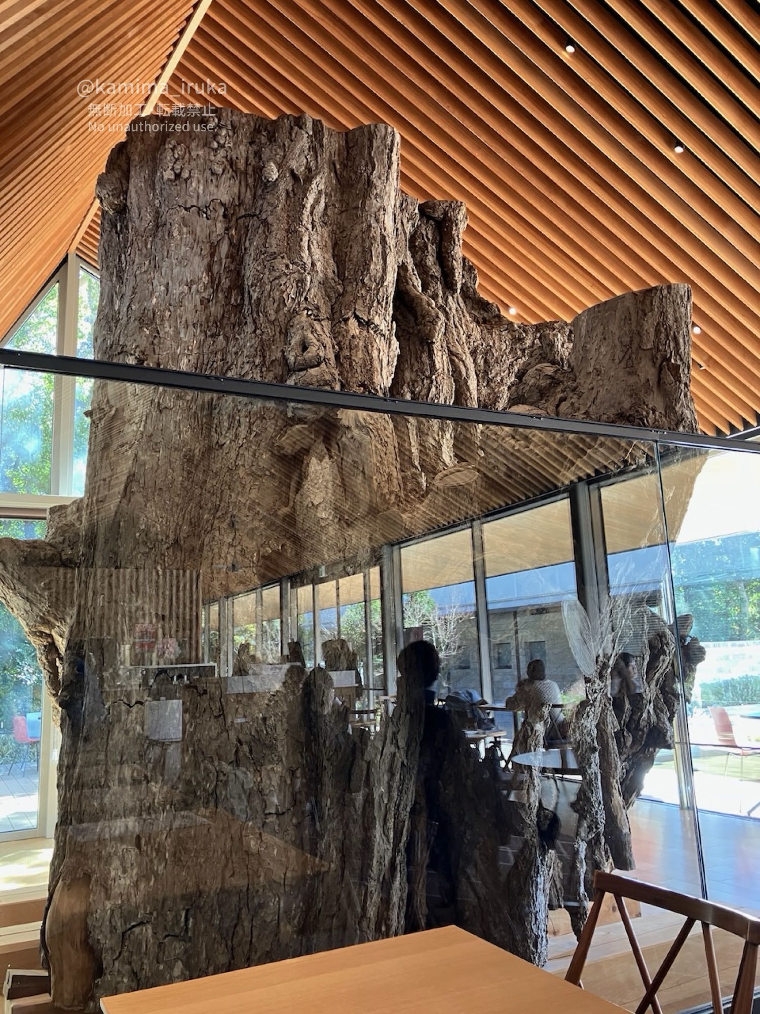 併設されたカフェには、2010年に強風により倒れてしまった樹齢1000年のご神木「大銀杏」の一部が保管されていました。