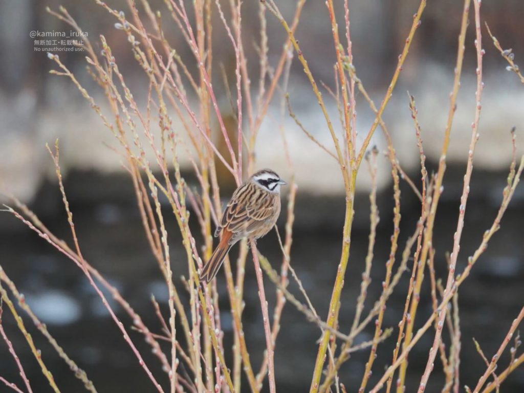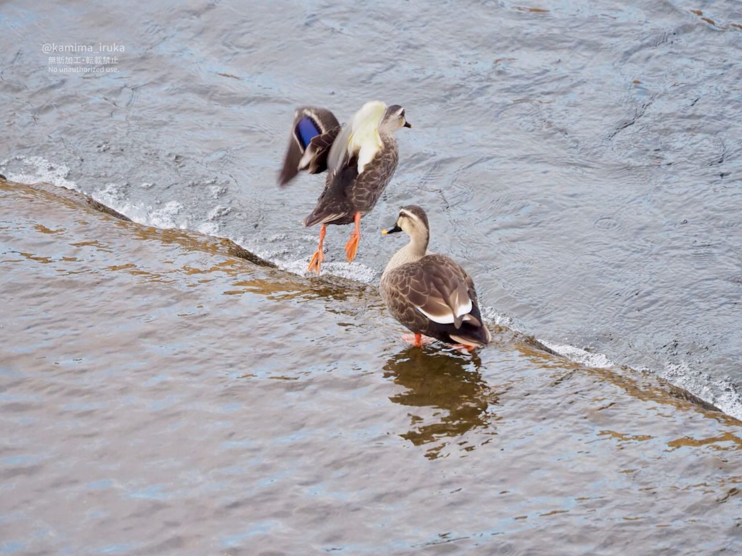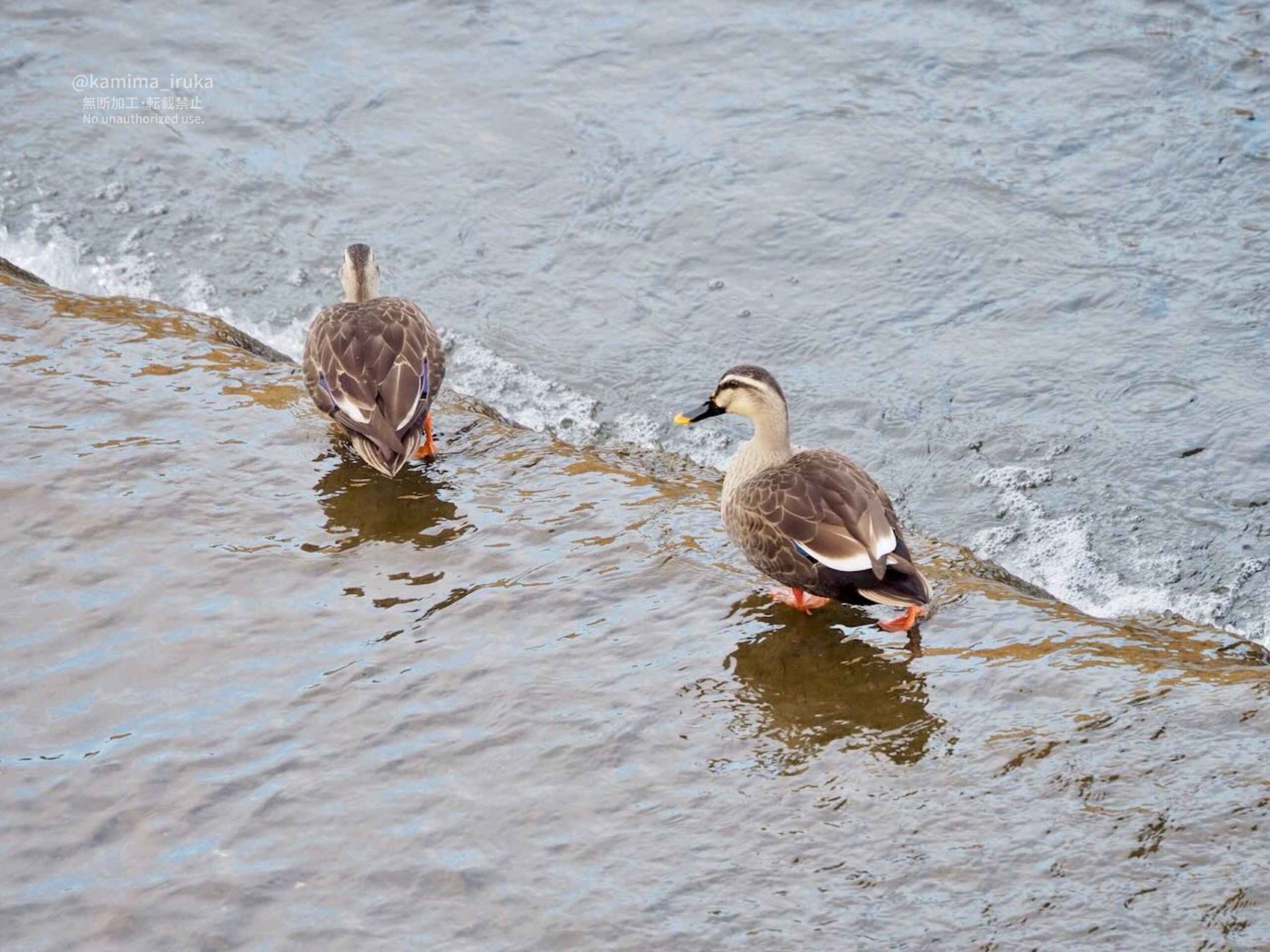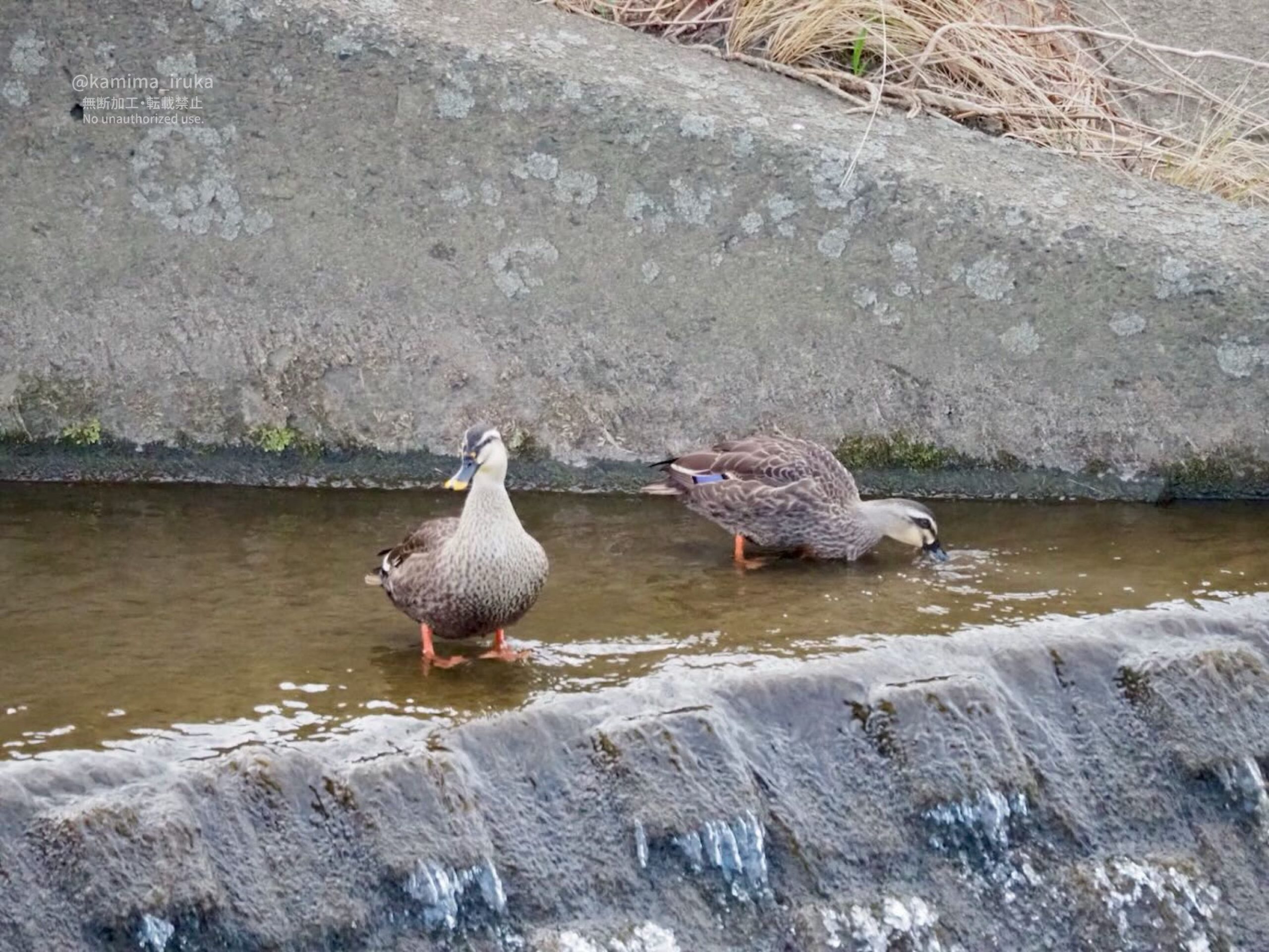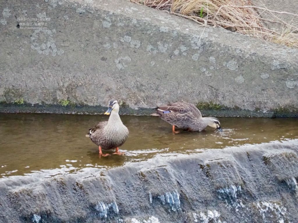 用水路が川に流れ込むところは、鳥たちの採餌&休憩場所としても人気。今朝は2羽のカルガモを見かけました。
