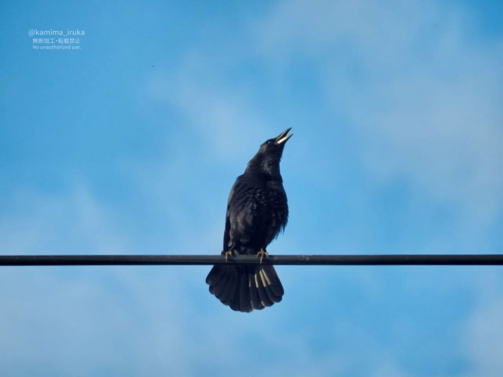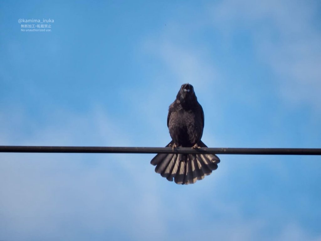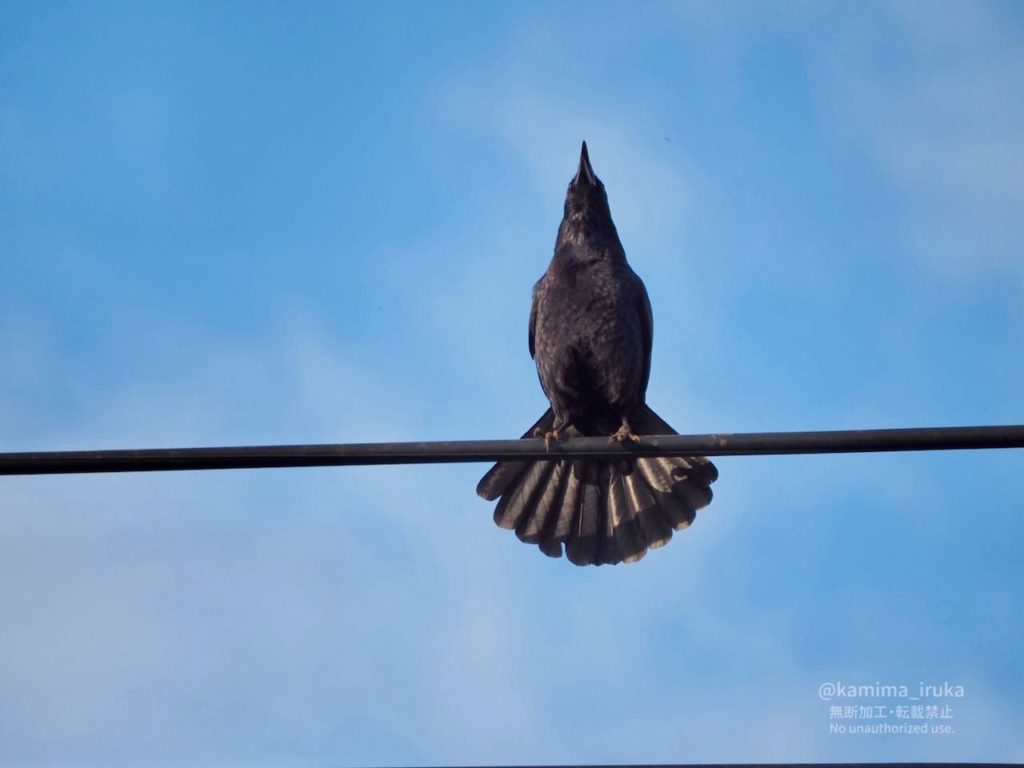 遠くから響いてくる仲間の声にじっと耳を傾けたあと、ぶわっと尾羽を拡げて、お辞儀するように身体をゆらしながら、エエ声でお返事するボソ氏。