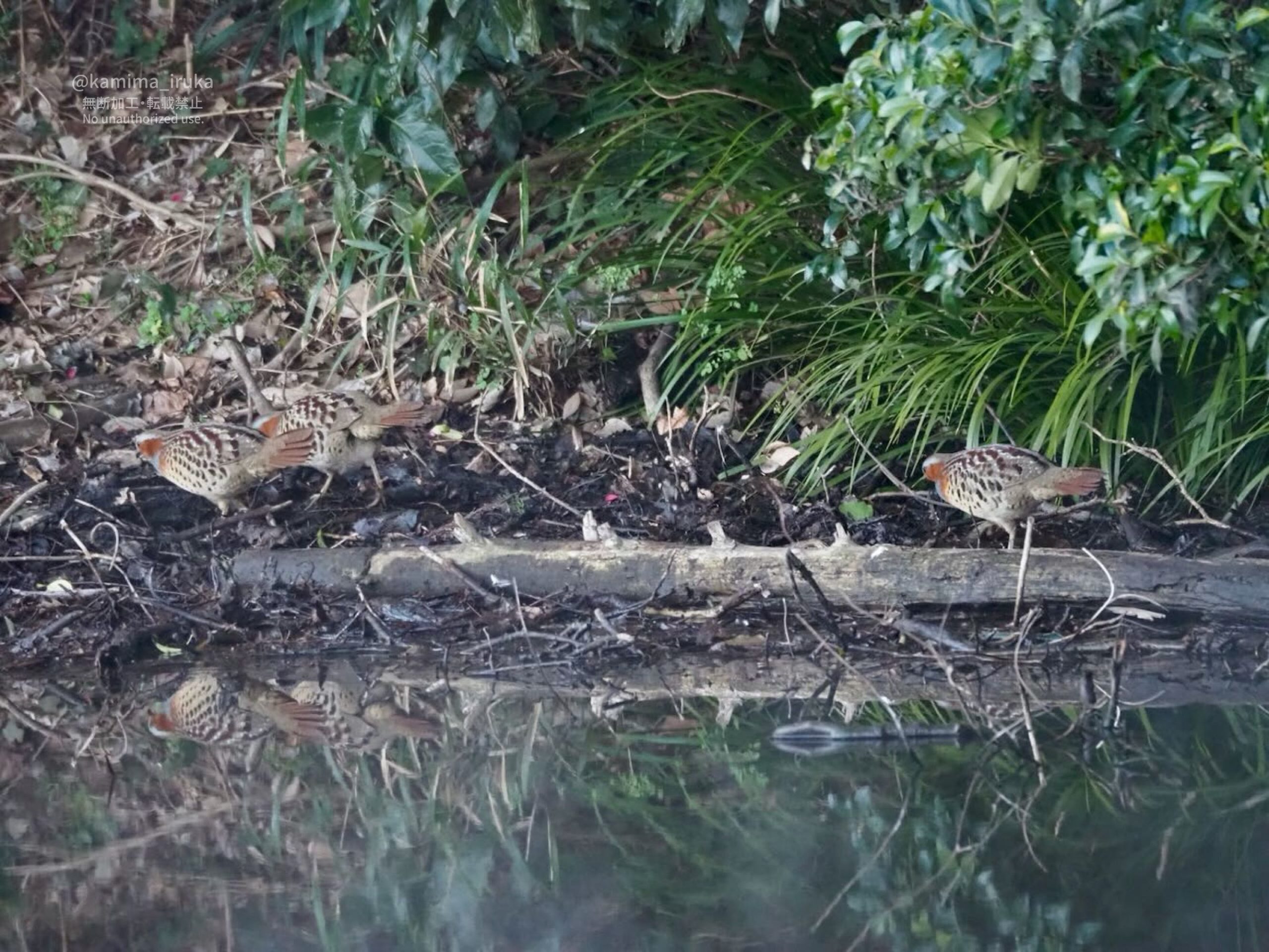 いつもの池で朝の散策中なコジュケイたち。おちりがカワイイネエ…☺️