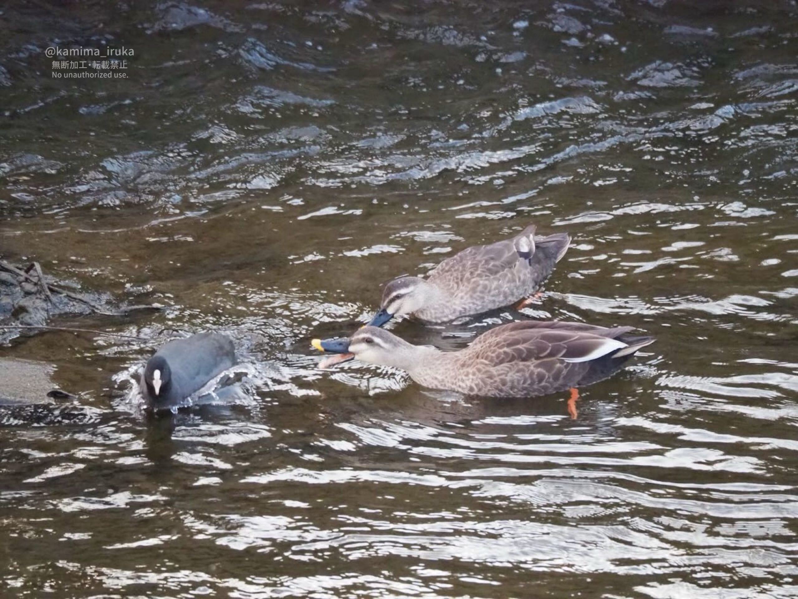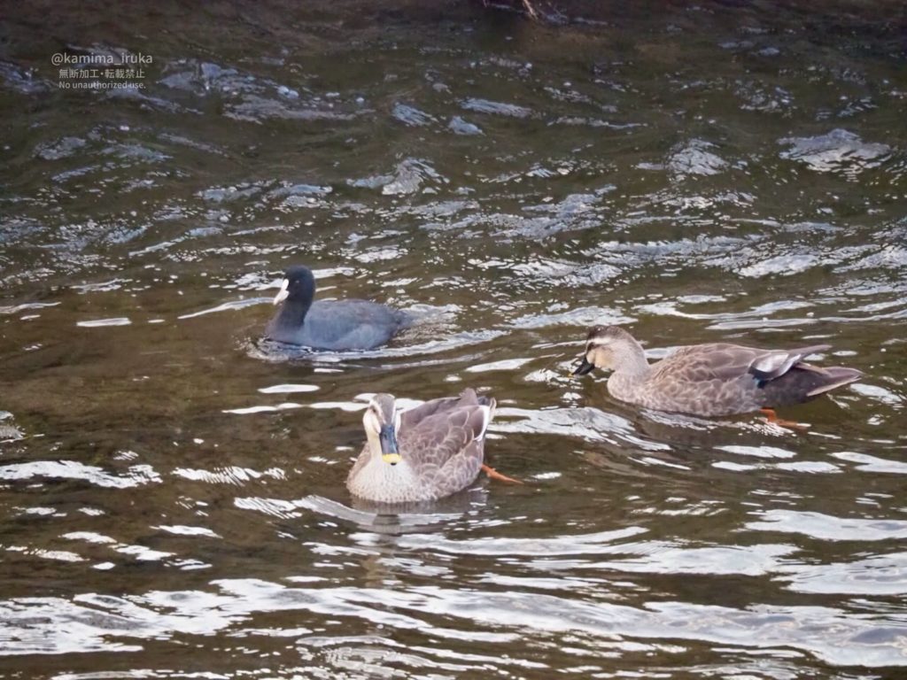 川では、オオバンとカルガモが仲良し…かと思いきや、小競り合い?していました。