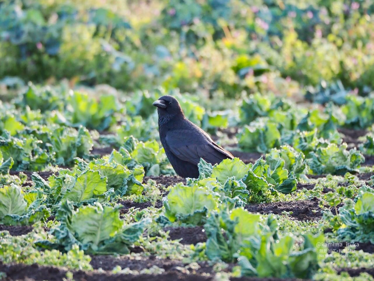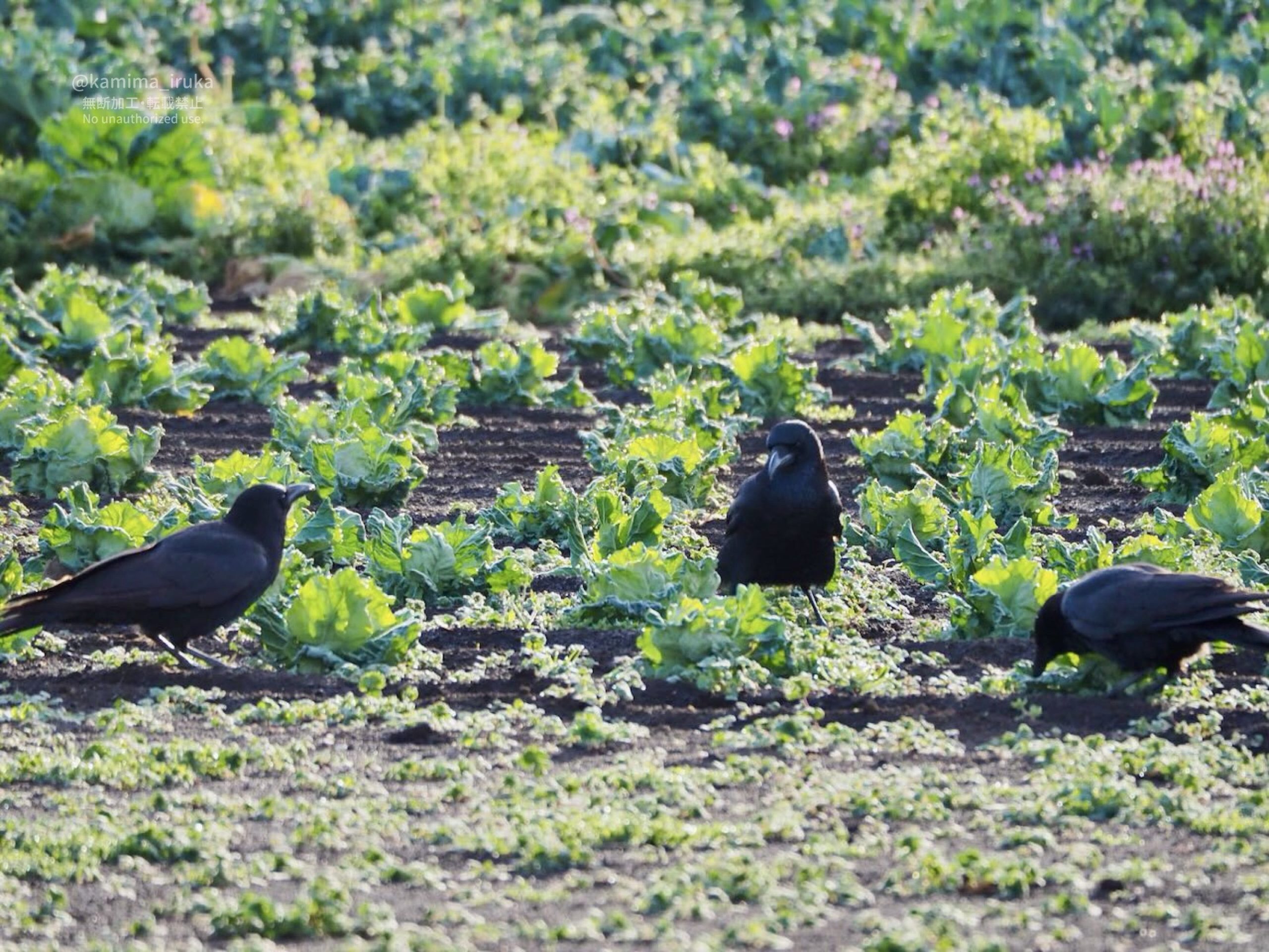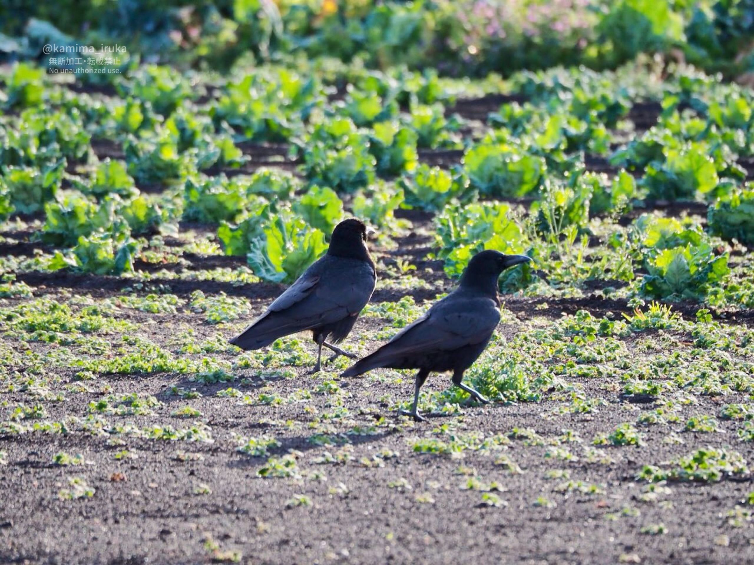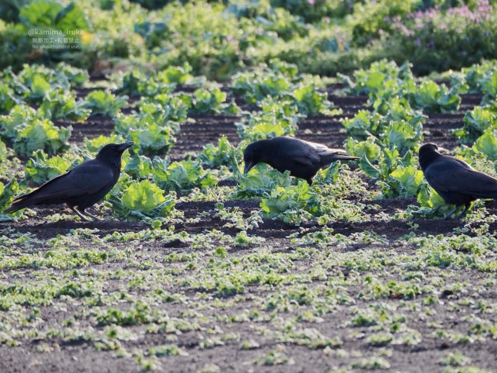 畑を闊歩するカラスのみんなたち。朝日に照らされて、なんかエモい感じに…。