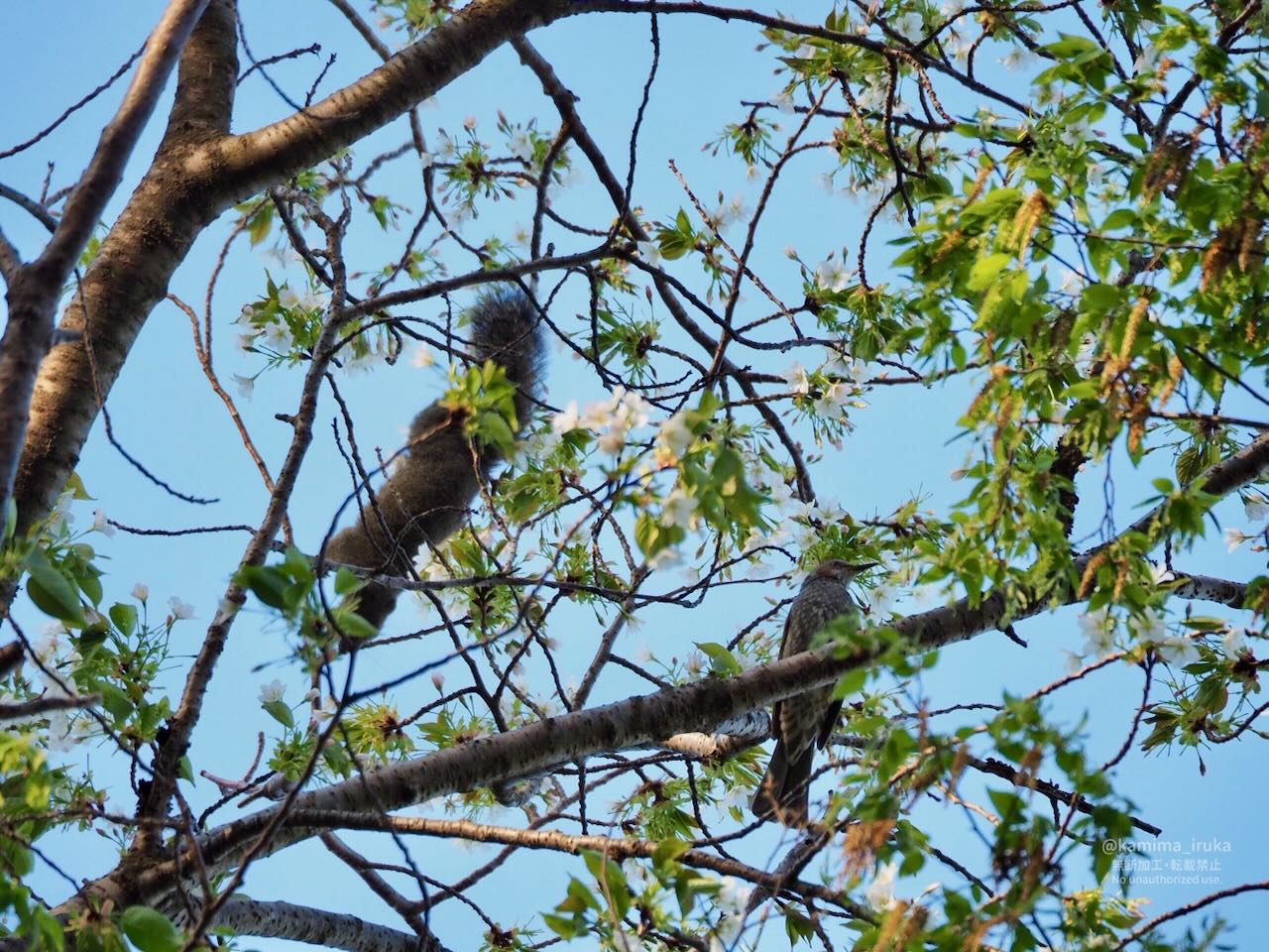 タイワンリスとヒヨちゃんが桜の木で朝食を同席していたり、カワセミちゃんがザリガニをゲットする瞬間を見たりしました。