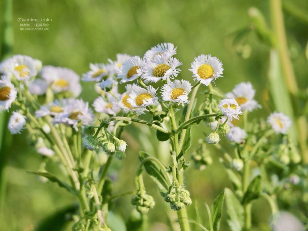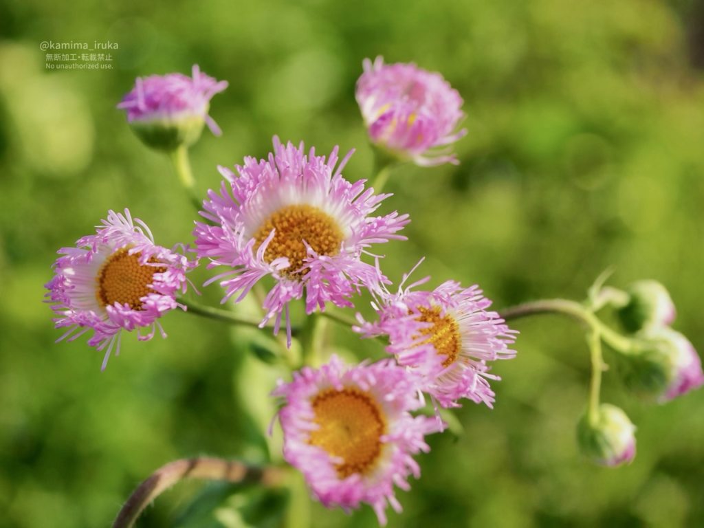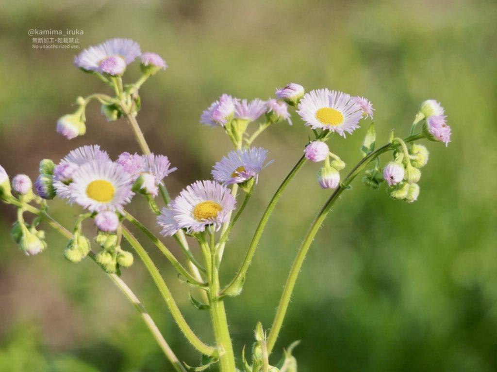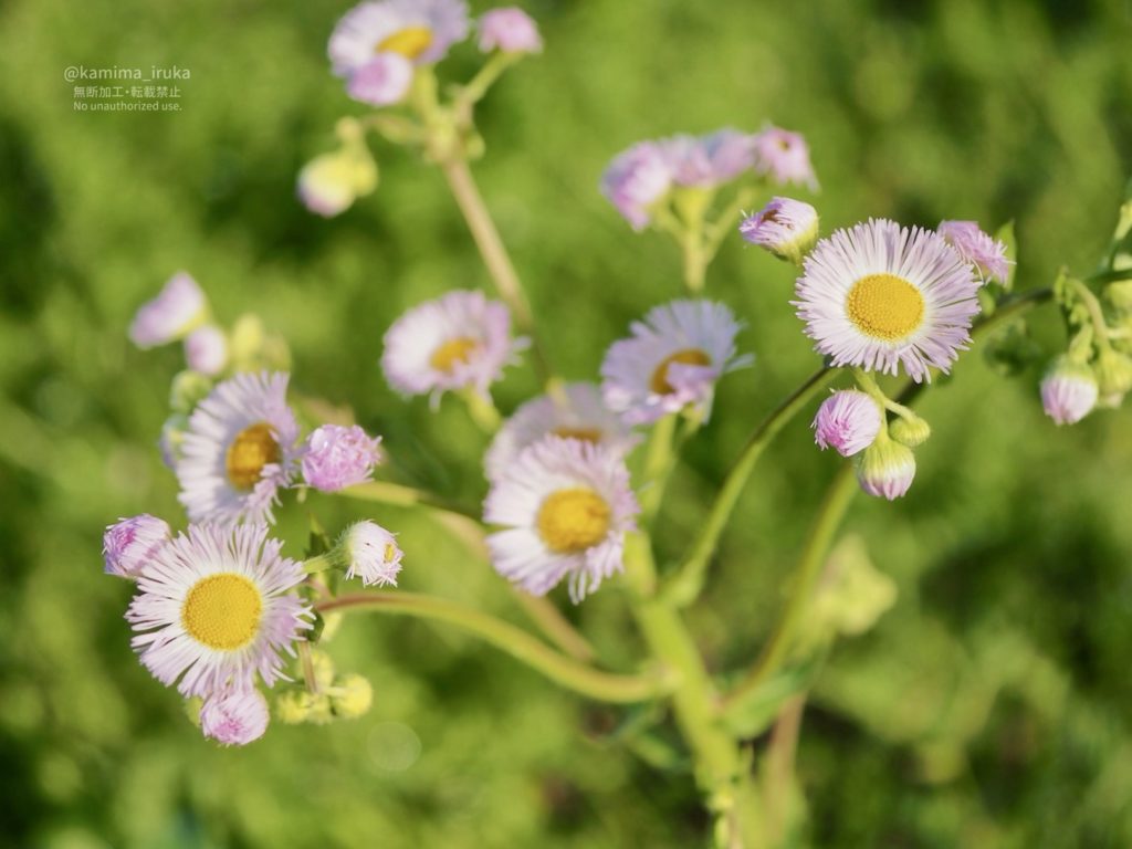 たまに「ピンクがヒメジオンで白いのがハルジオン」説を聞きますが、花の色は関係なくて、蕾や葉の付き方で区別するそうですな〜