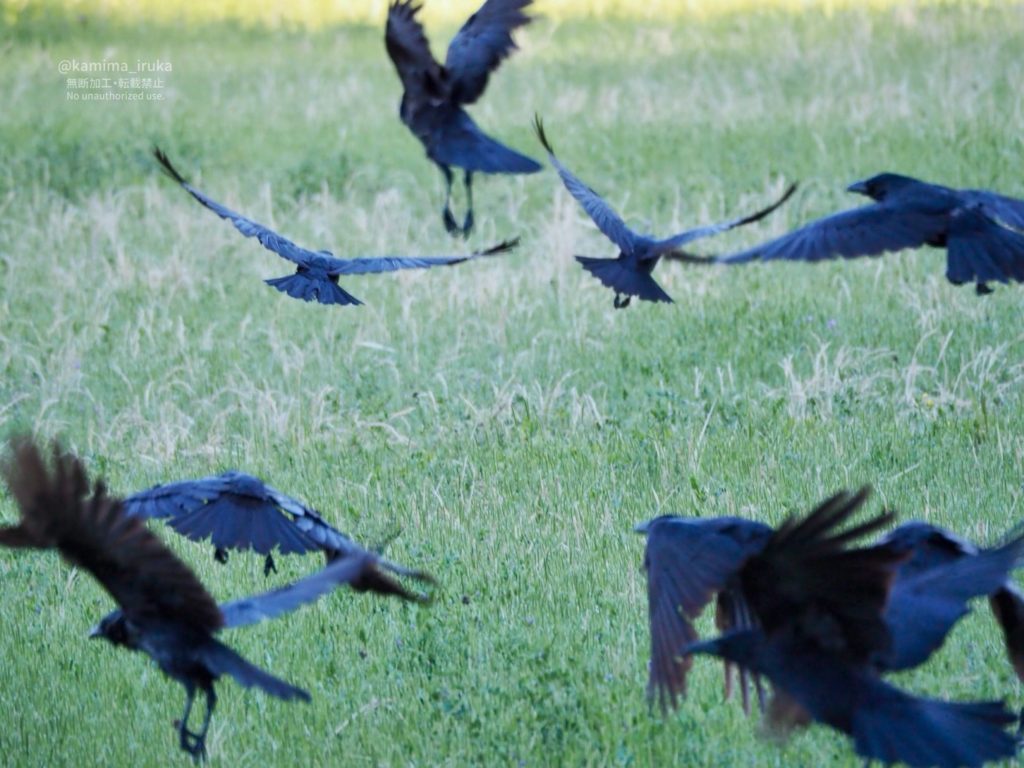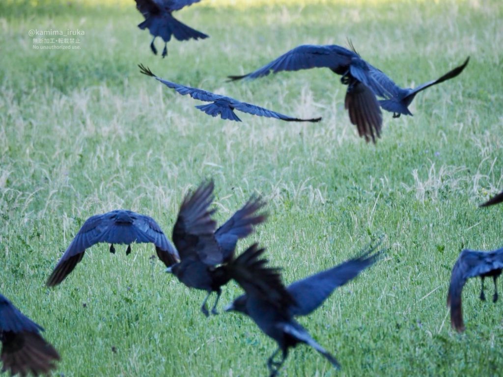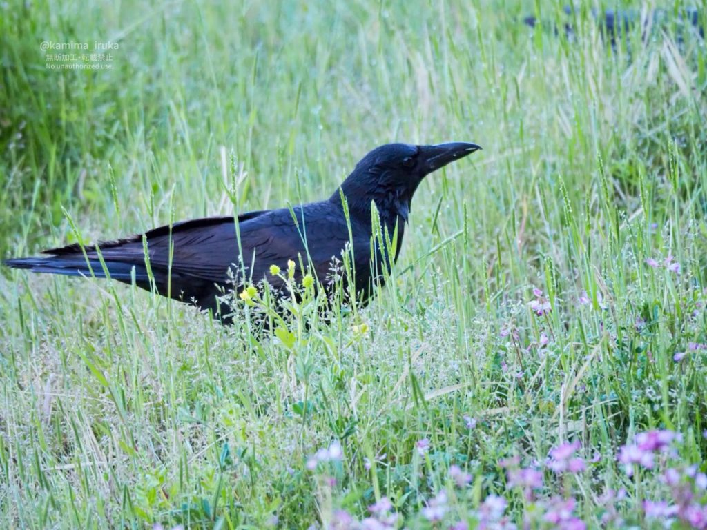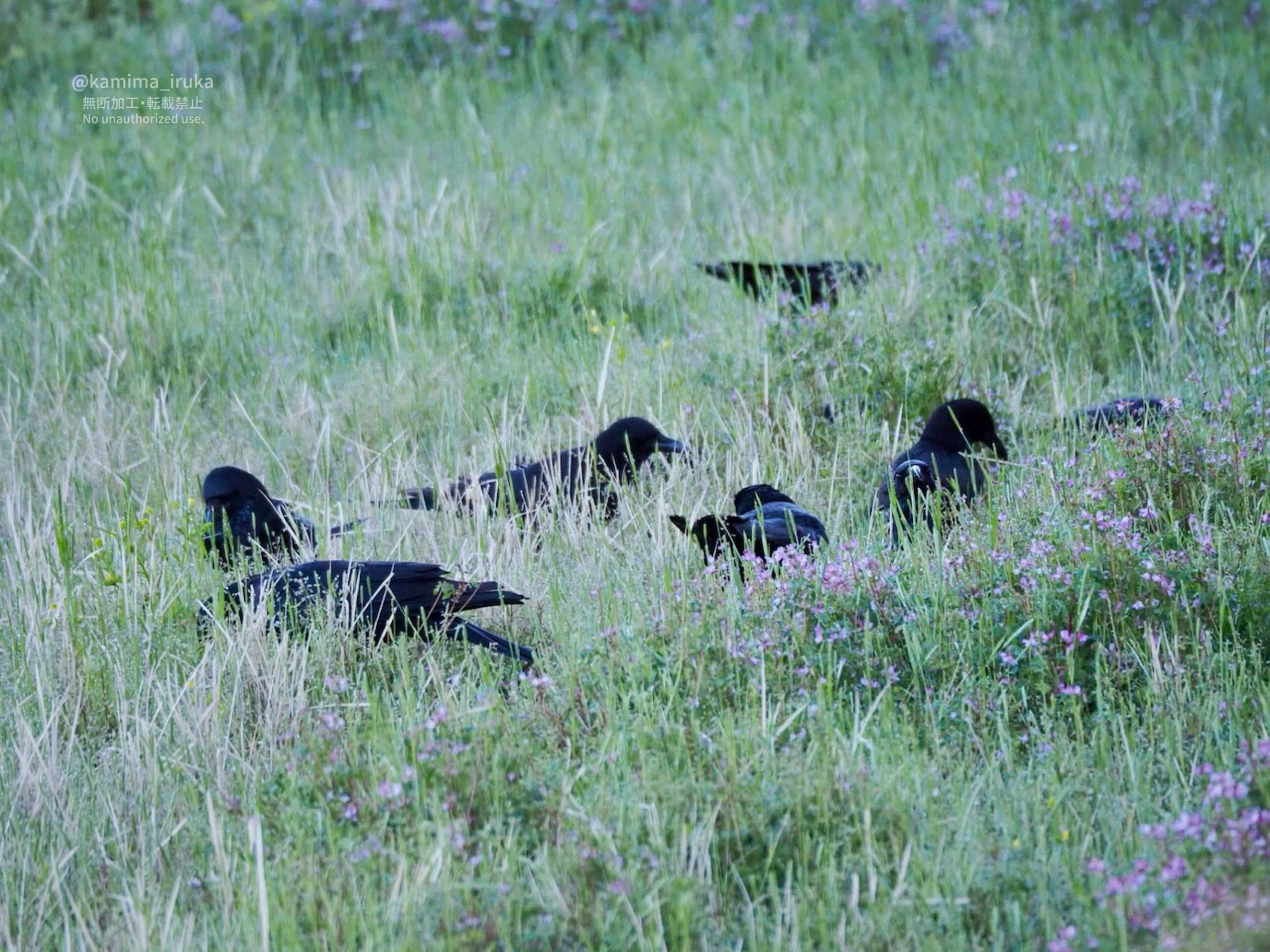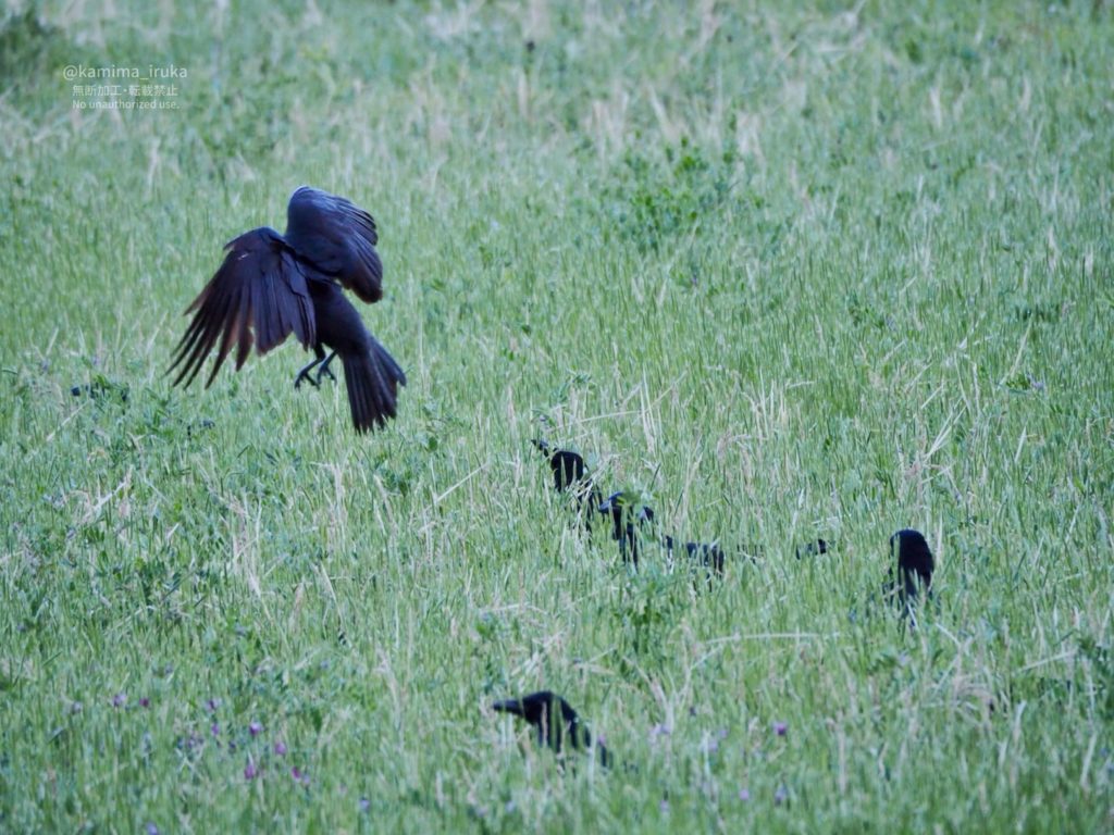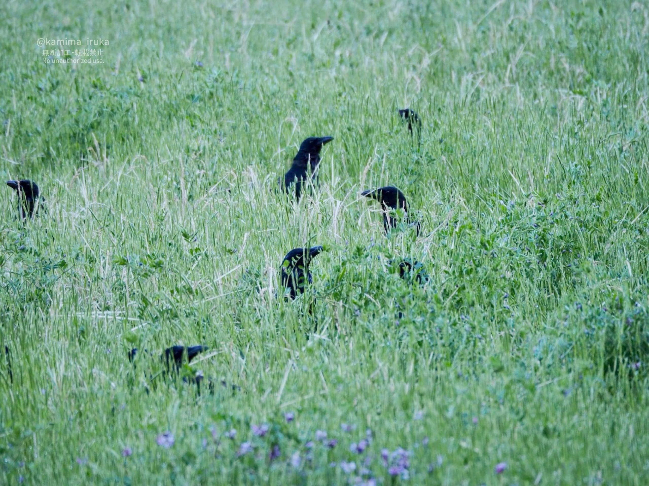 雑草の生えた田んぼからひょこひょこ頭を出すハシボソガラスのみんなたち