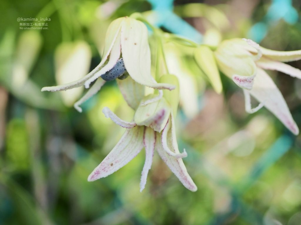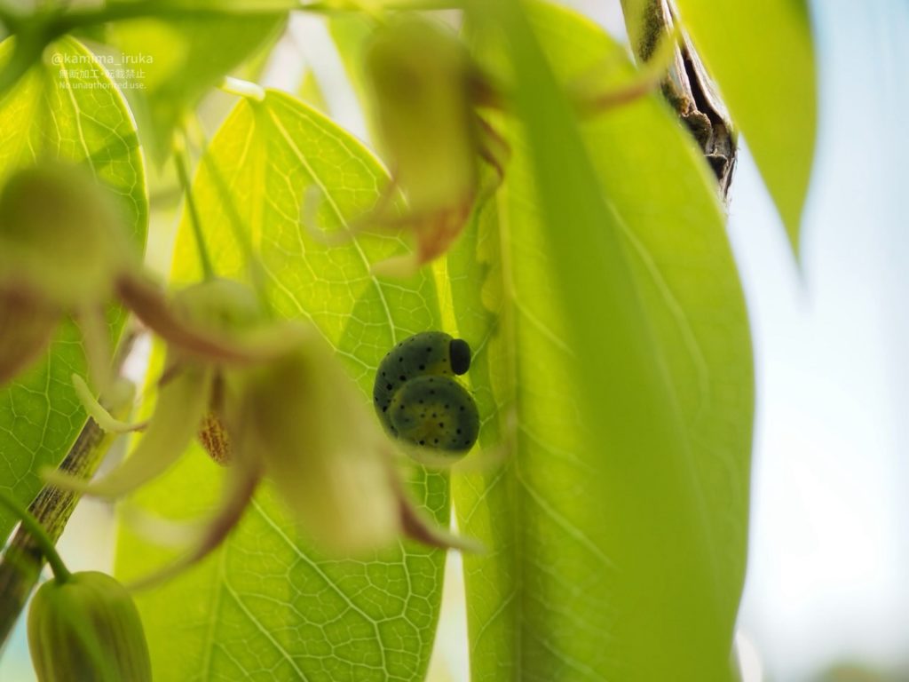 アケビコンボウハバチの幼虫ちゃんが葉の上をのこのこ歩いたり、くるりんと丸まって落ち着いておりました。