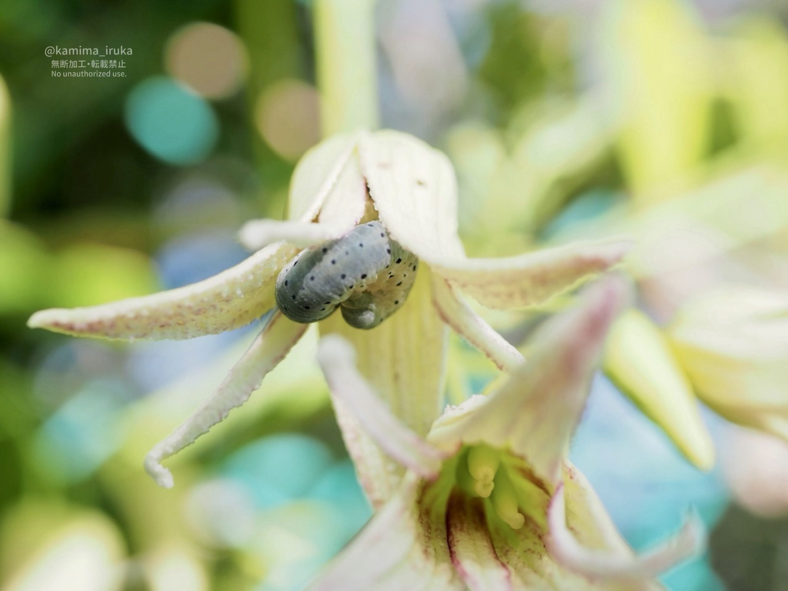 短いおてて(脚と腹脚)をいっしょうけんめい伸ばしていたので、「落ちないかな…」とハラハラしつつウォーキングしてきたのですが、帰りにもう一度見たら、くるんと花におさまってて安心しました。