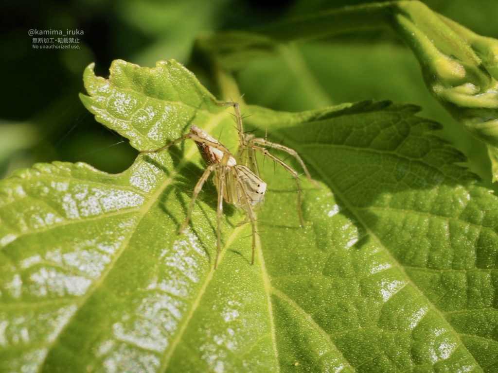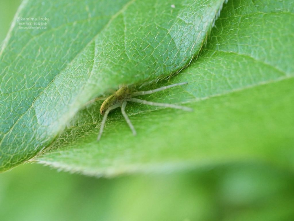 はっぱの陰に潜みがちなキンイロエビグモちゃん