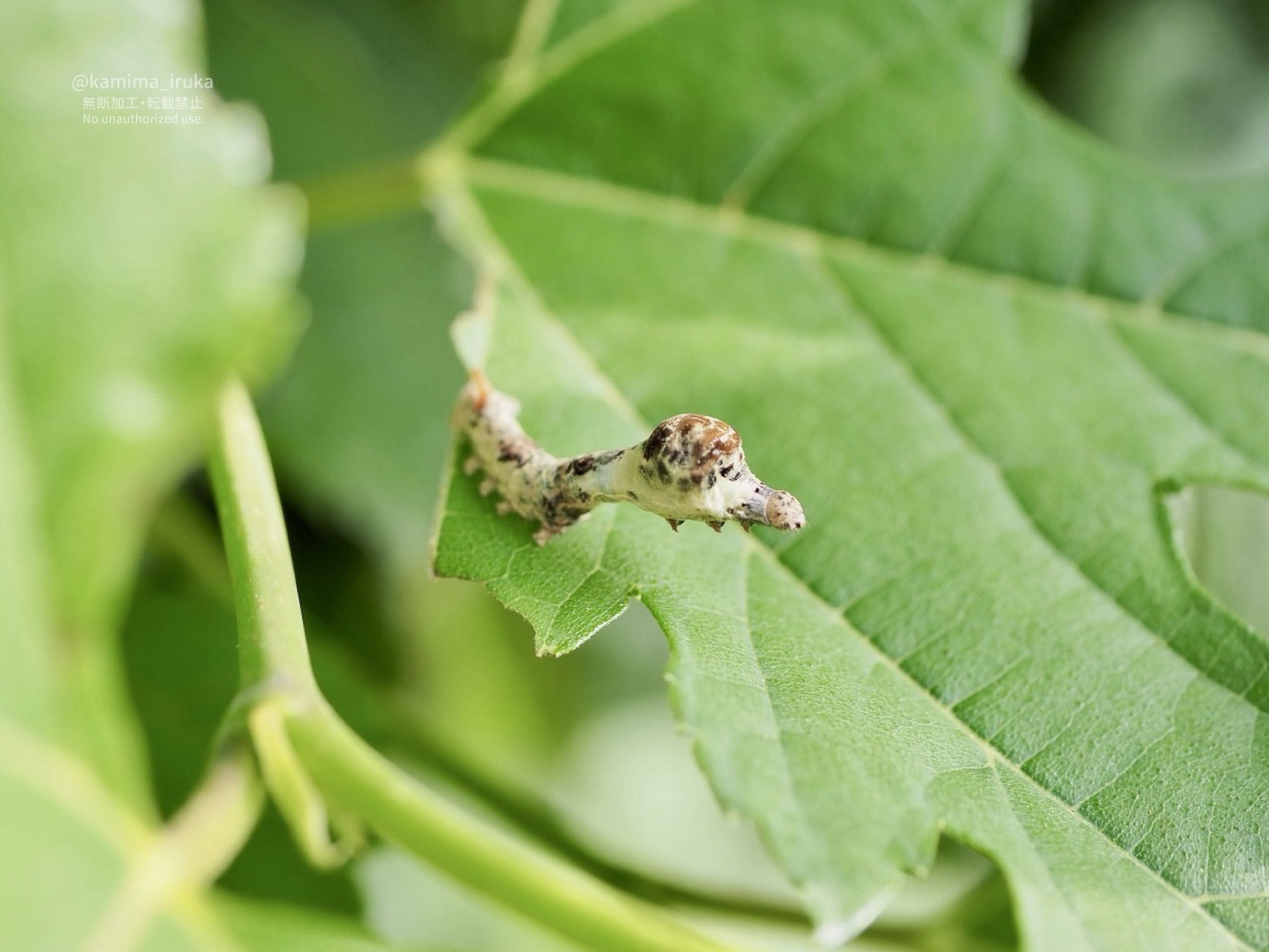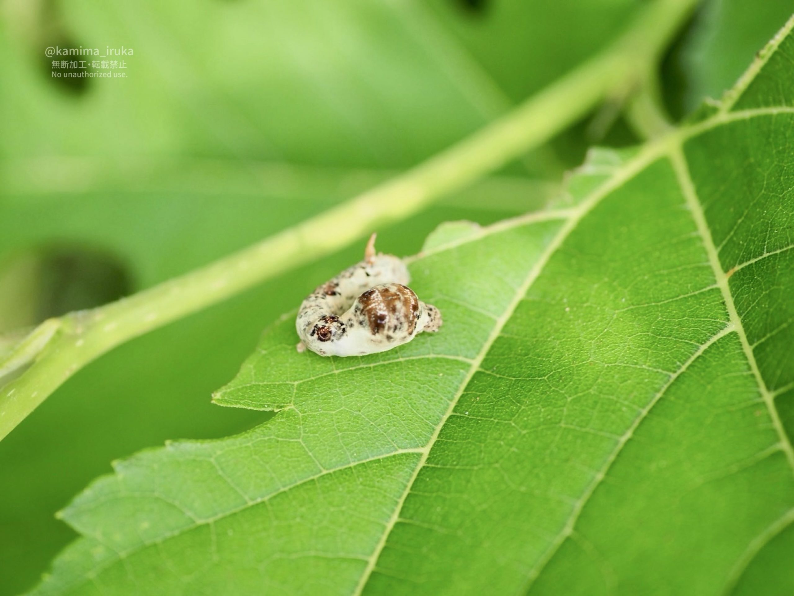 なんか面白い形のイモムシちゃんがおるな…鳥の糞に擬態しているっぽい色形。
