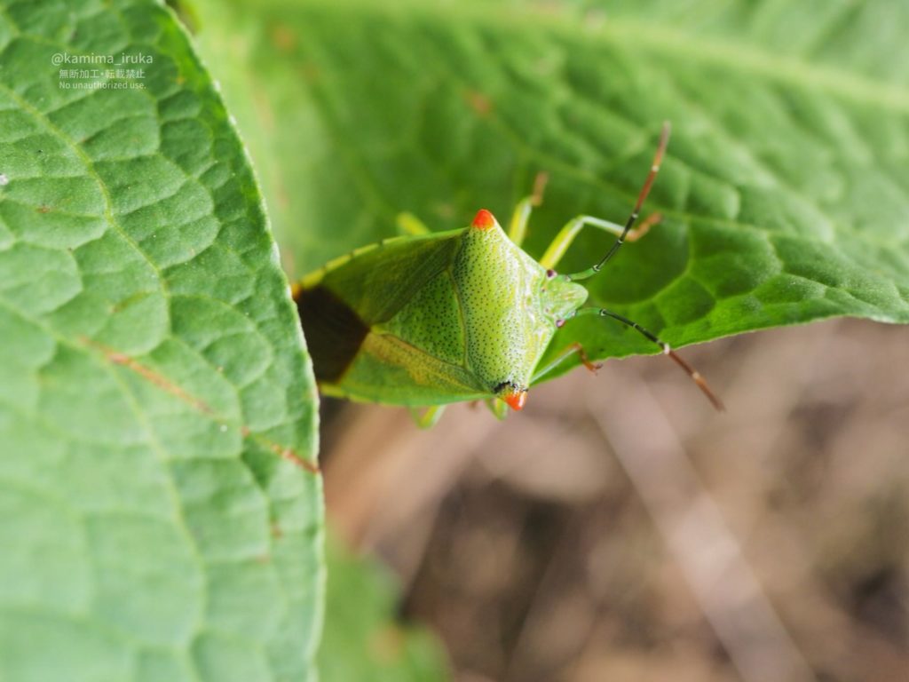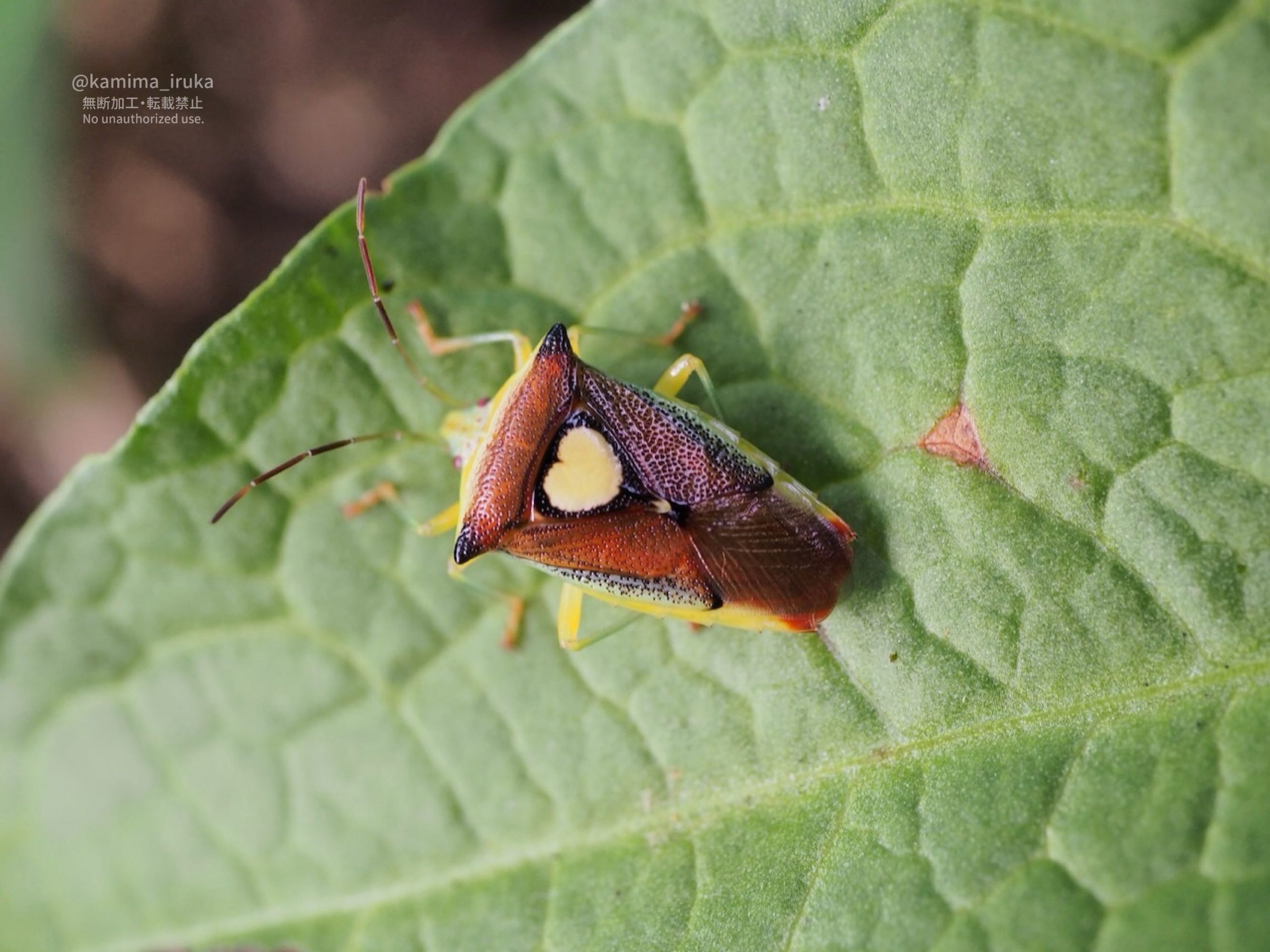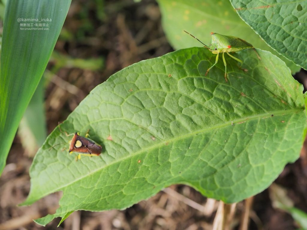 偶然おなじ葉っぱの上にいた、エサキモンキツノカメムシ💛ちゃんと、ハサミツノカメムシ♀ちゃん。