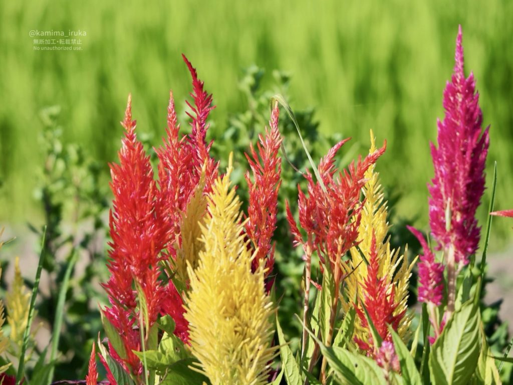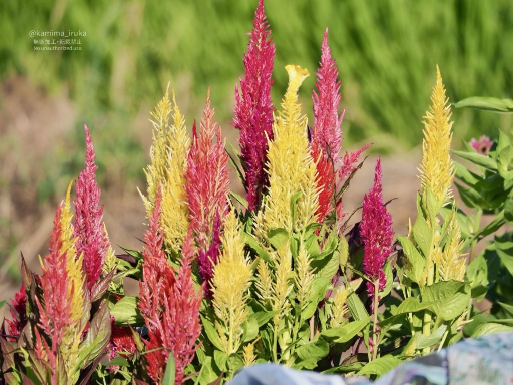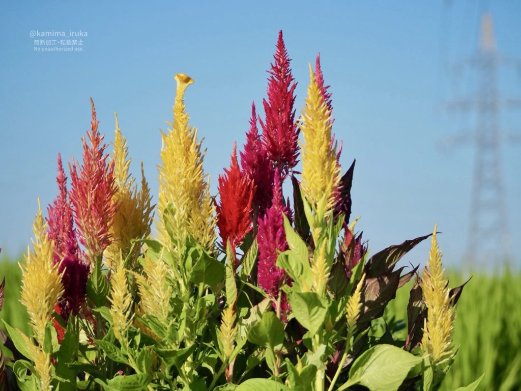 ケイトウが真っ赤に燃えさかっていたり、木陰にハグロトンボが飛んでいたり
