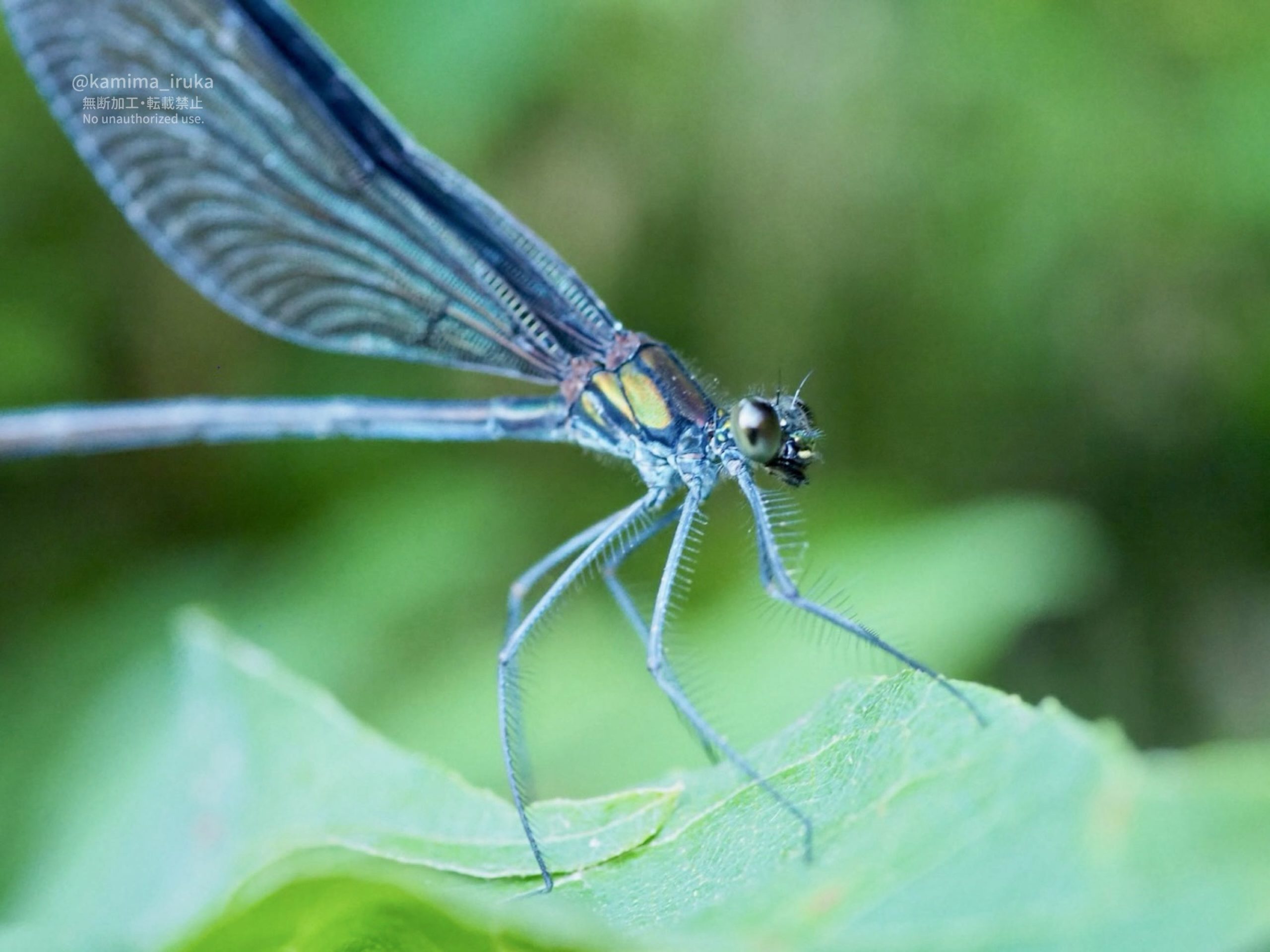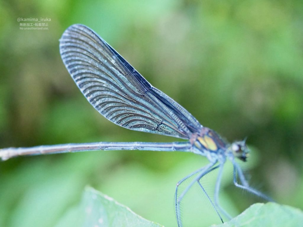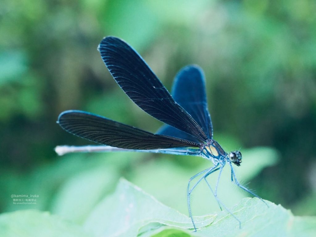 葉っぱの上で休憩中のハグロトンボさん。ゆっくりと翅を拡げて、ヒラッと畳む優雅な姿を間近で撮らせてくれました(スローモーションではなく等倍です)