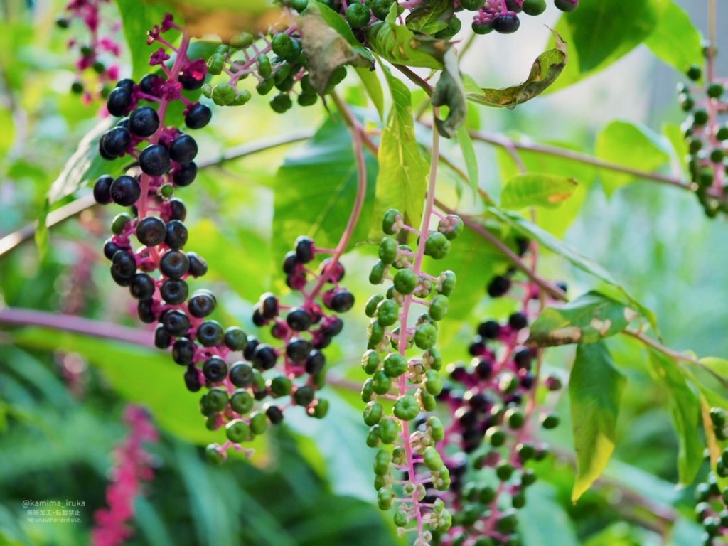 ヨウシュヤマゴボウがいい感じに色づいてきたり、まっしろいカエルちゃんに会ったり