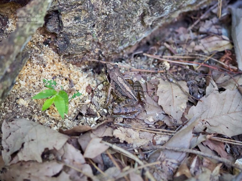アカガエルちゃんは、動いていないと落ち葉に紛れてぜんぜん気付けないぜ…