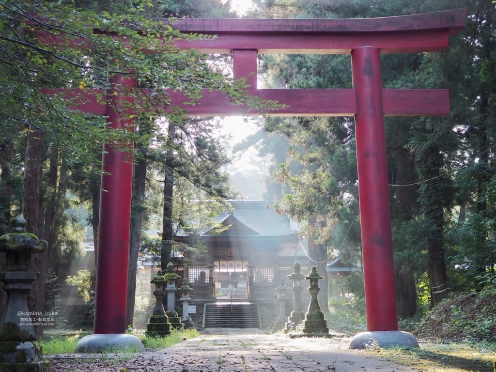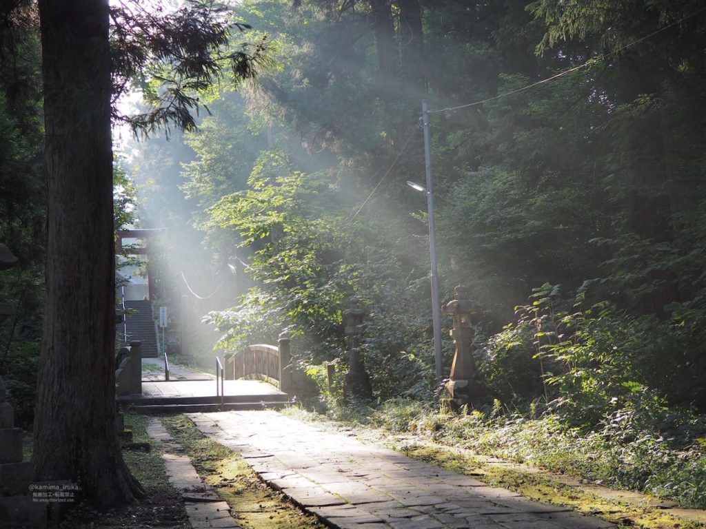鎮守の森からふりそそぐ朝陽は、眩しくも静謐に。