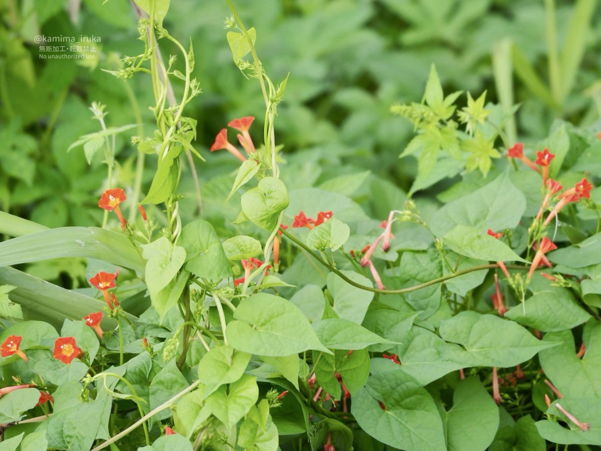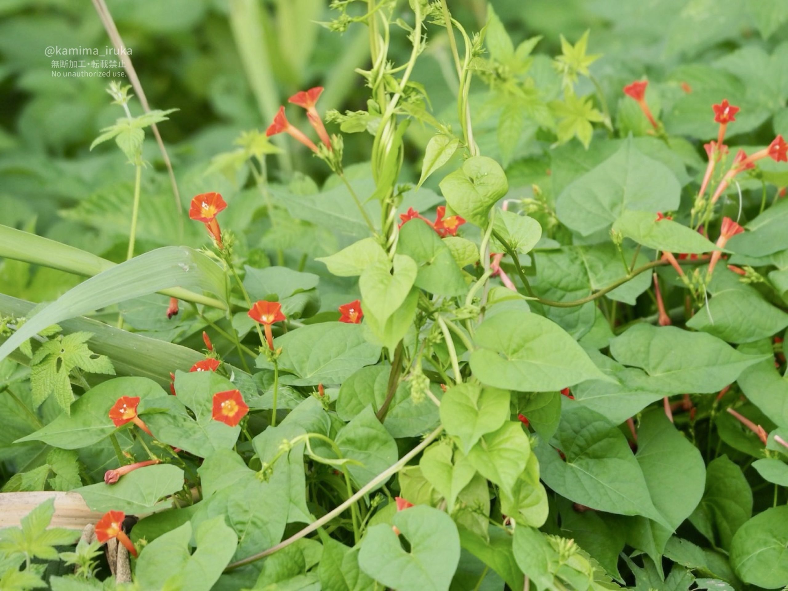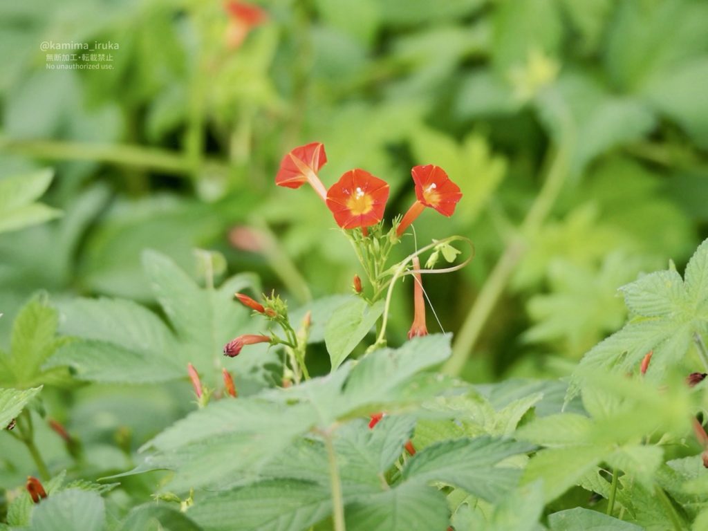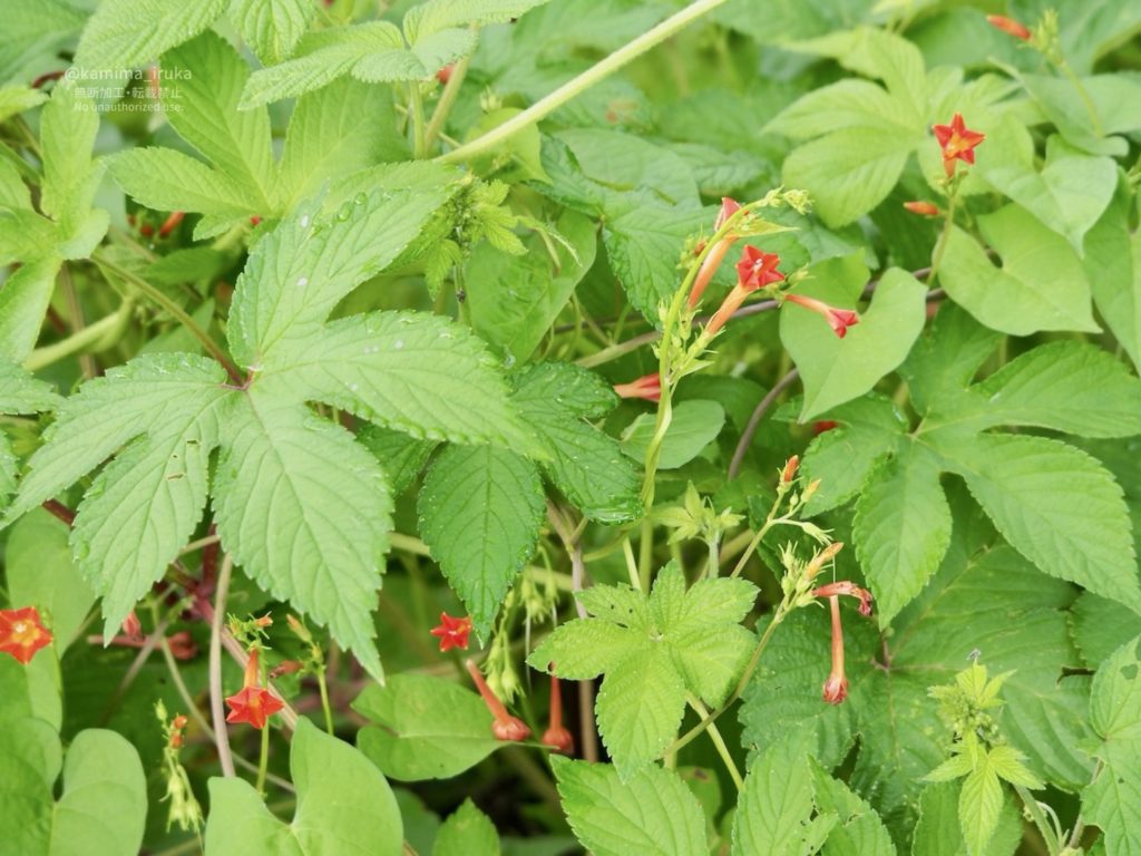 小さくとも鮮やかな朱色の花が目立つ、ヒルガオ科らしきつる性植物がおりました。マルバルコウ(丸葉縷紅)…?