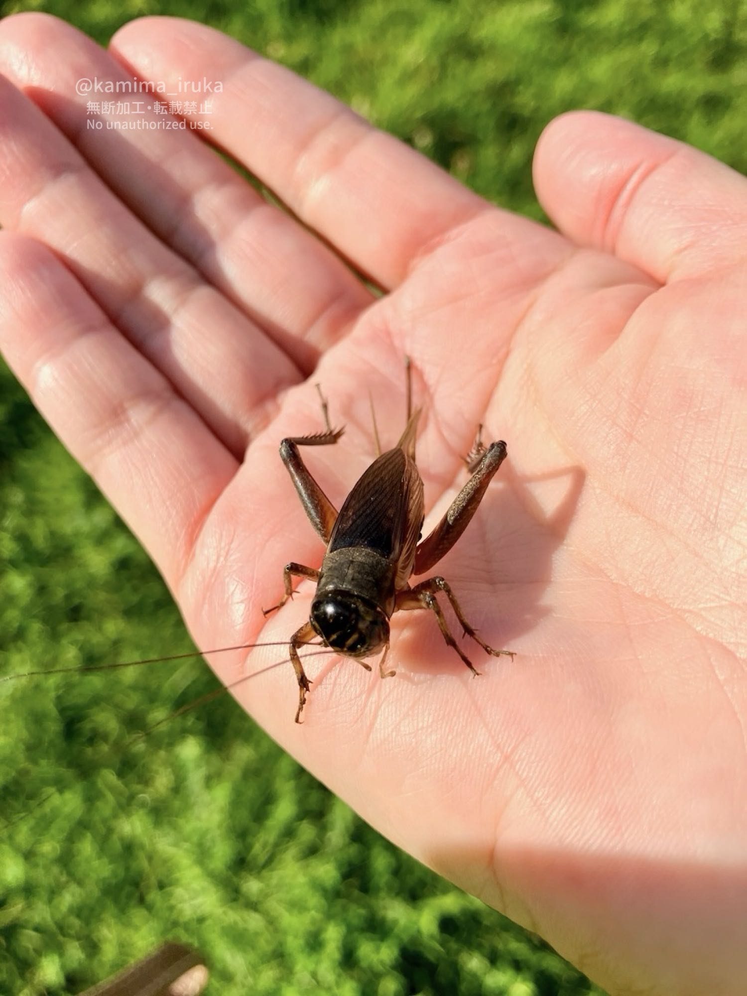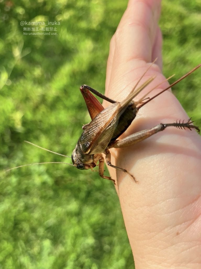 コオロギちゃんがよちよちと道路を横断していたので、公園の草までお送りしてきました。産卵管があるので♀ちゃんですかね。
