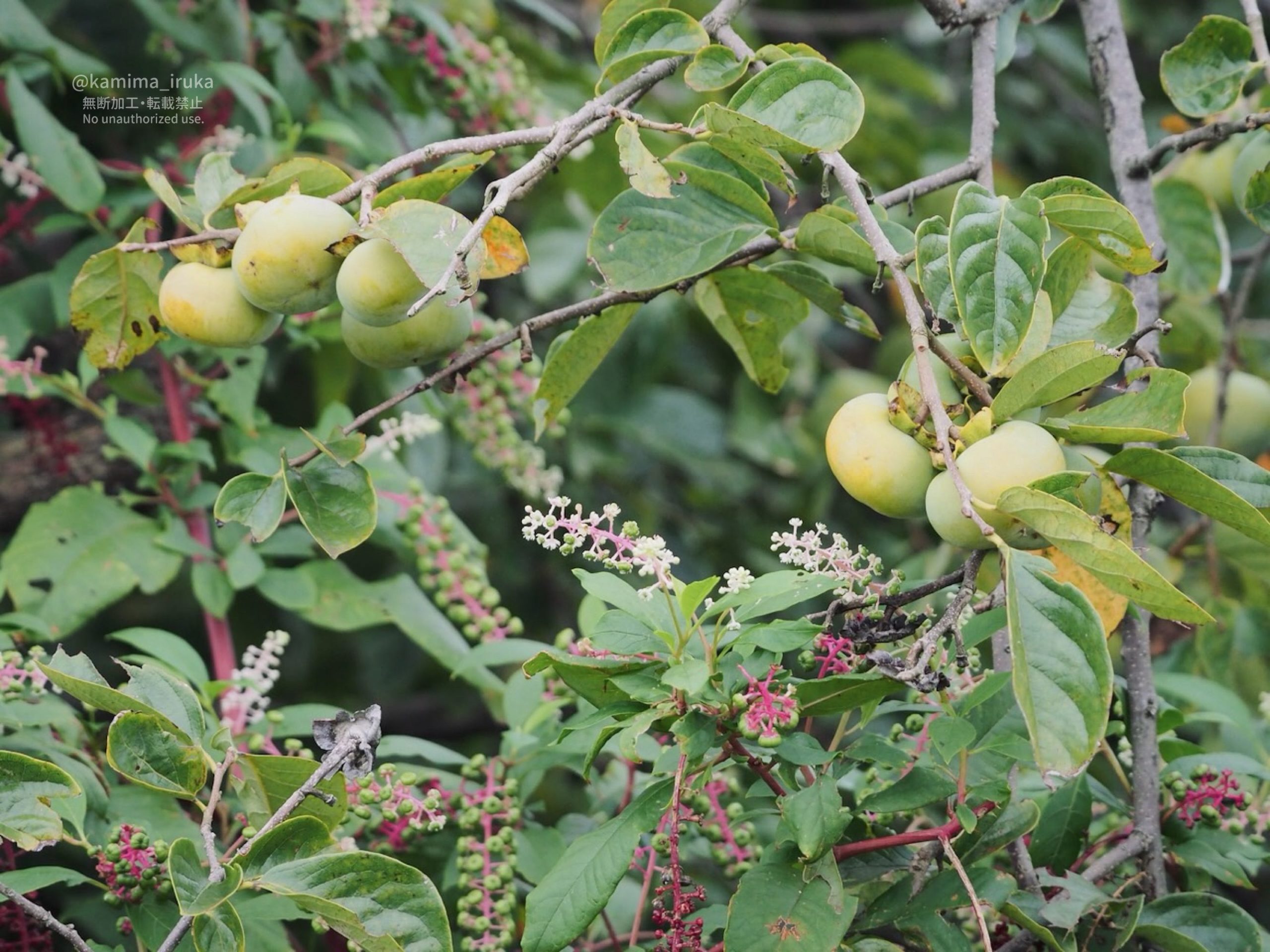 柿とヨウシュヤマゴボウのコンビネーションや、倒れて渦を巻いている稲穂(はやく収穫してあげて…)に、そこはかとなく「秋」を感じておりました。