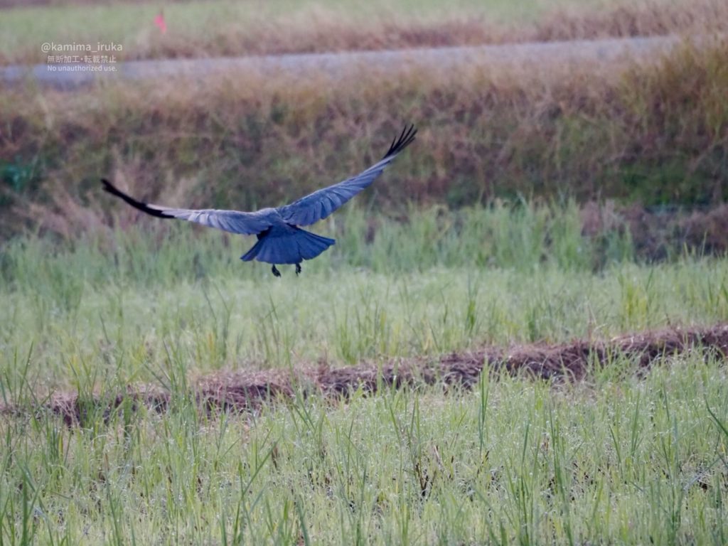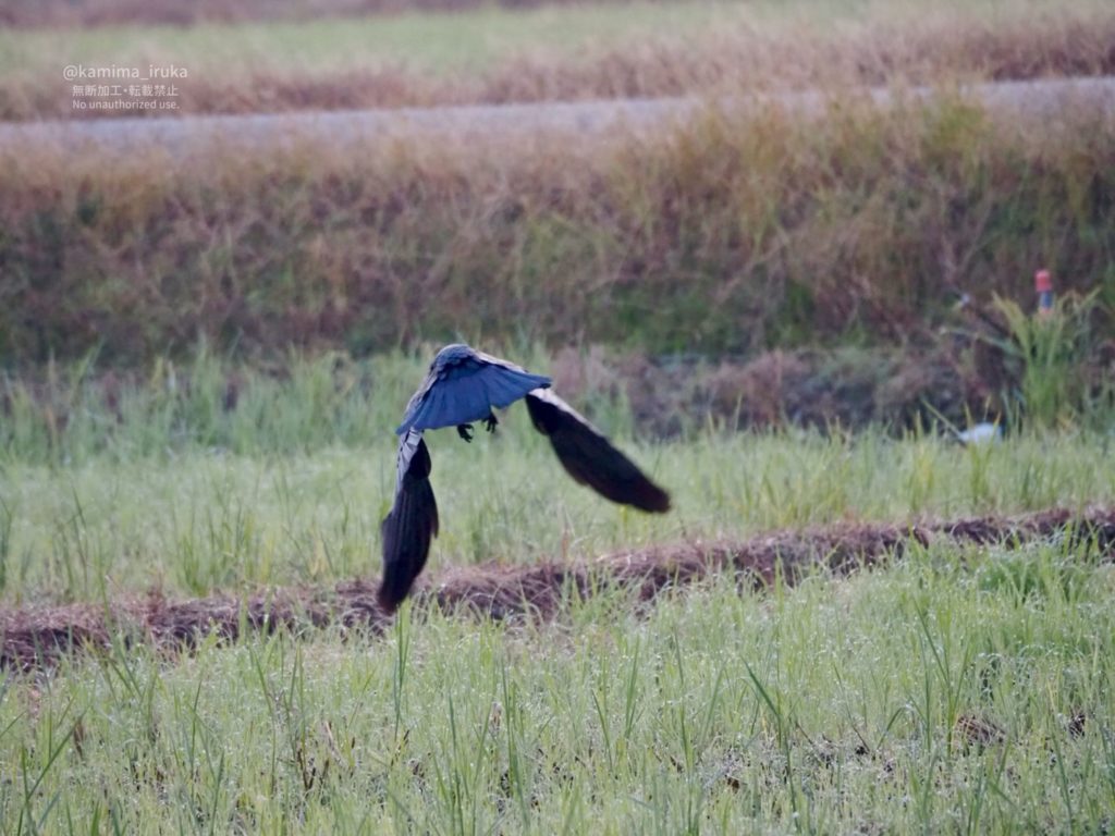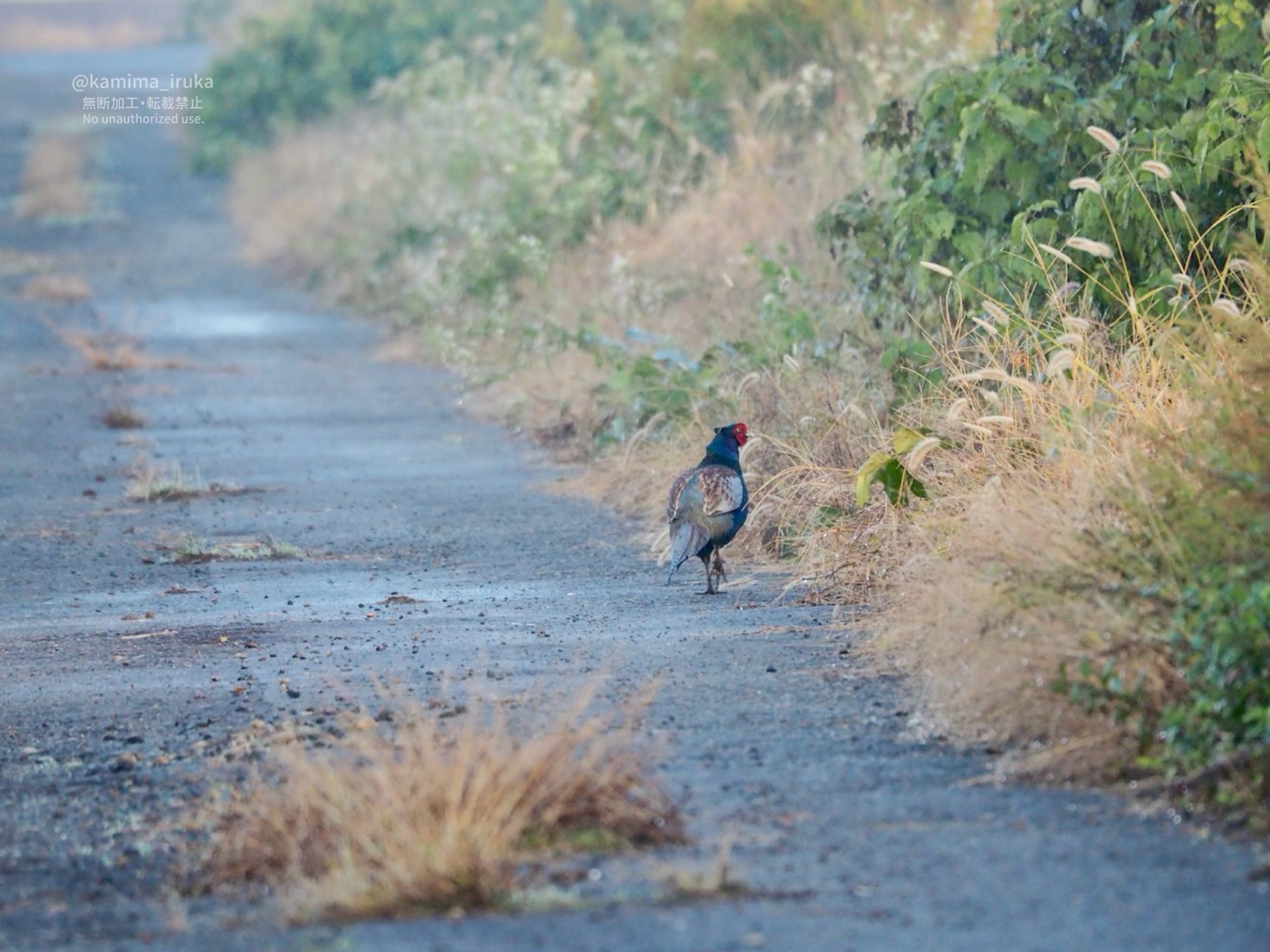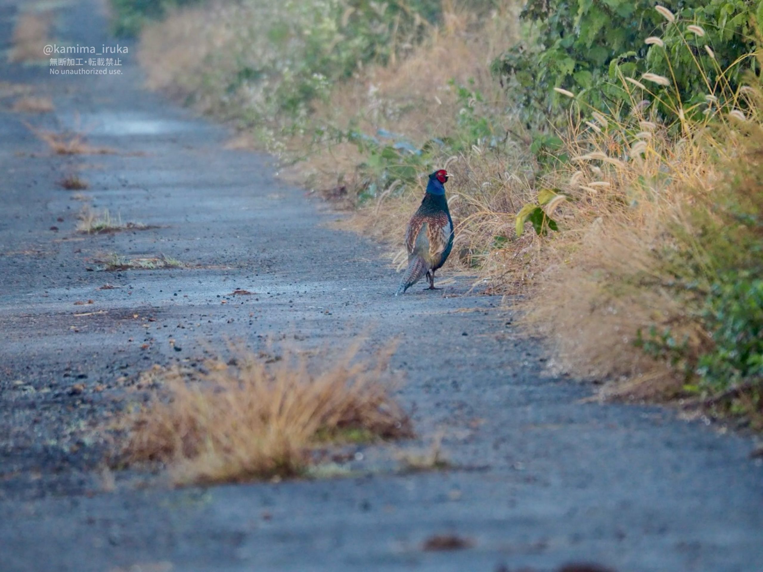農道をポテポテ歩くキジくんと、田んぼをひとり(一羽)あるき、飛び去るボソ氏。