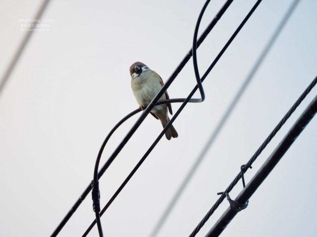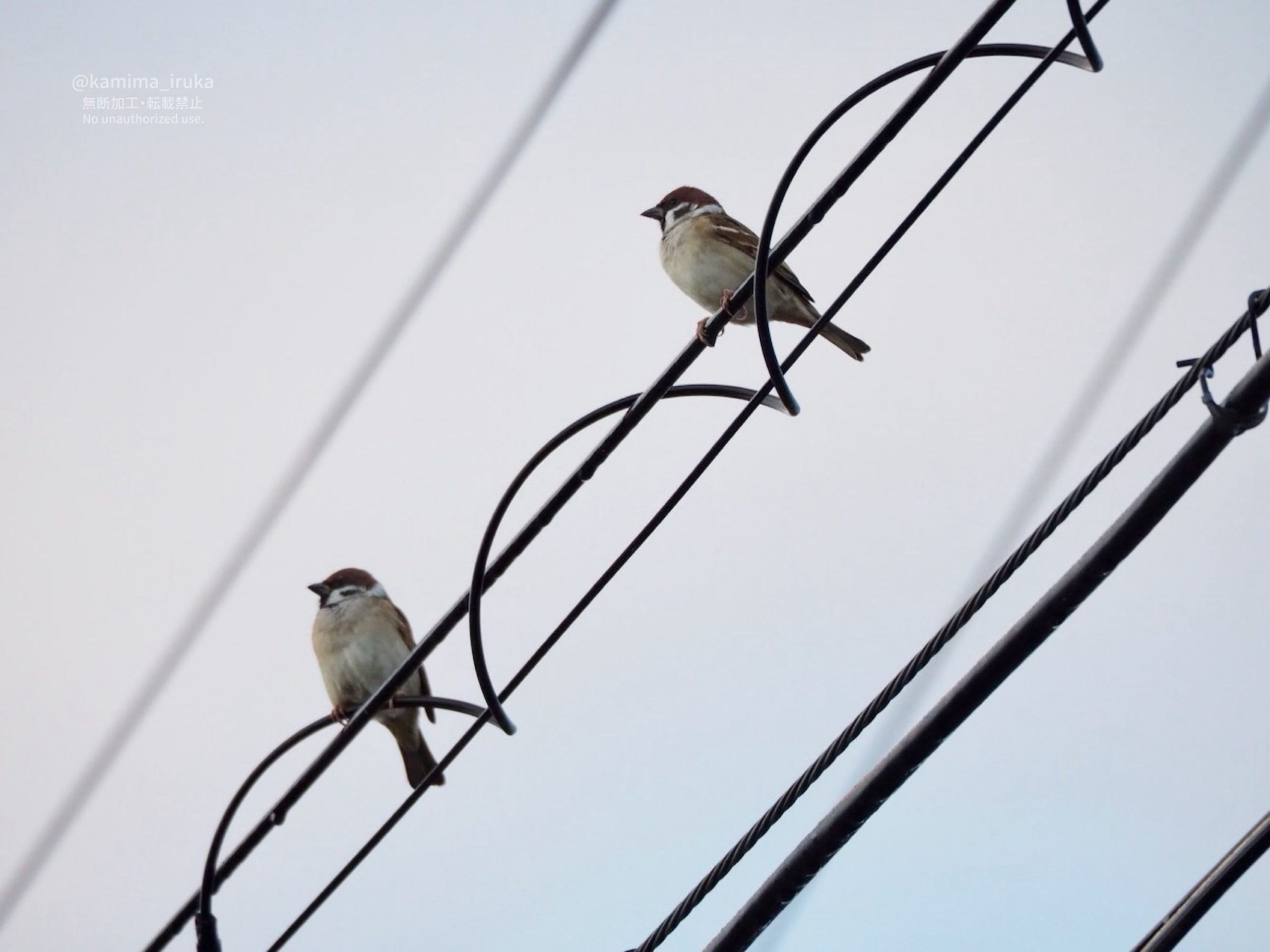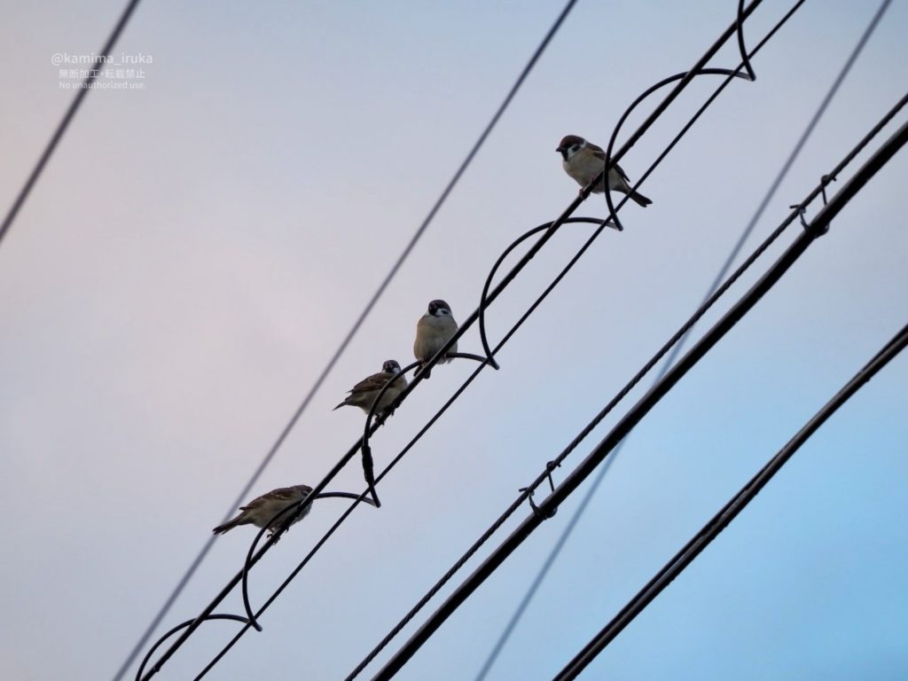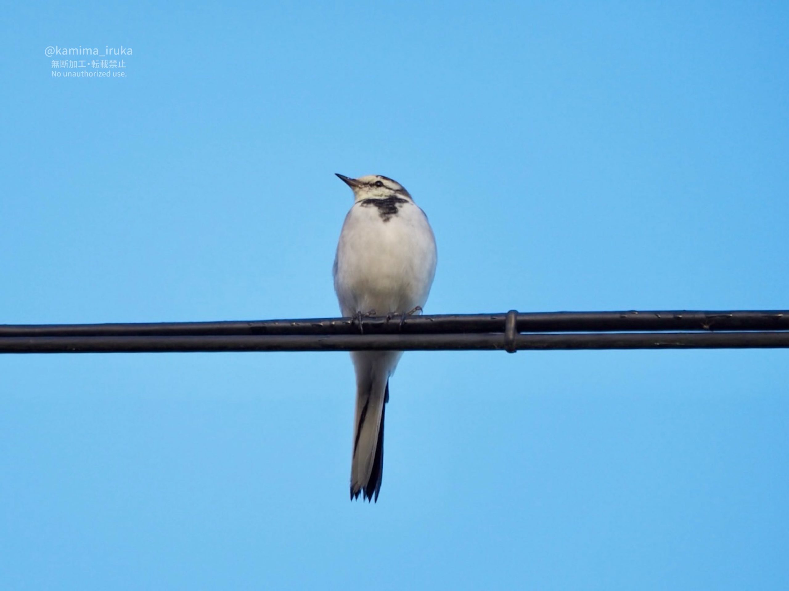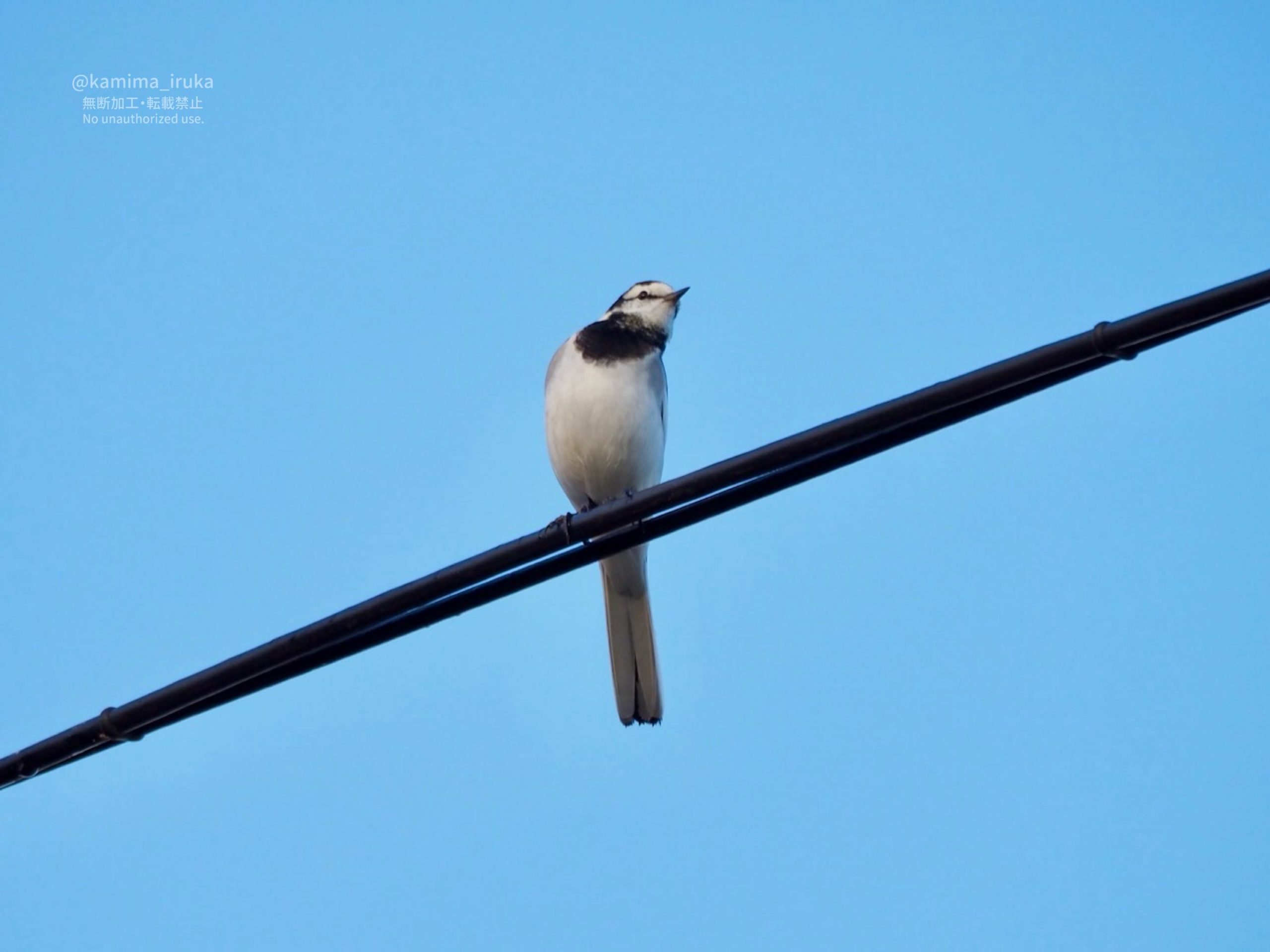 電線の下からチュンたちのモフモフおなかと、ハクセキレイご夫婦のオシャレなおなか。(胸の黒い模様がクッキリしているほうが♂くん)