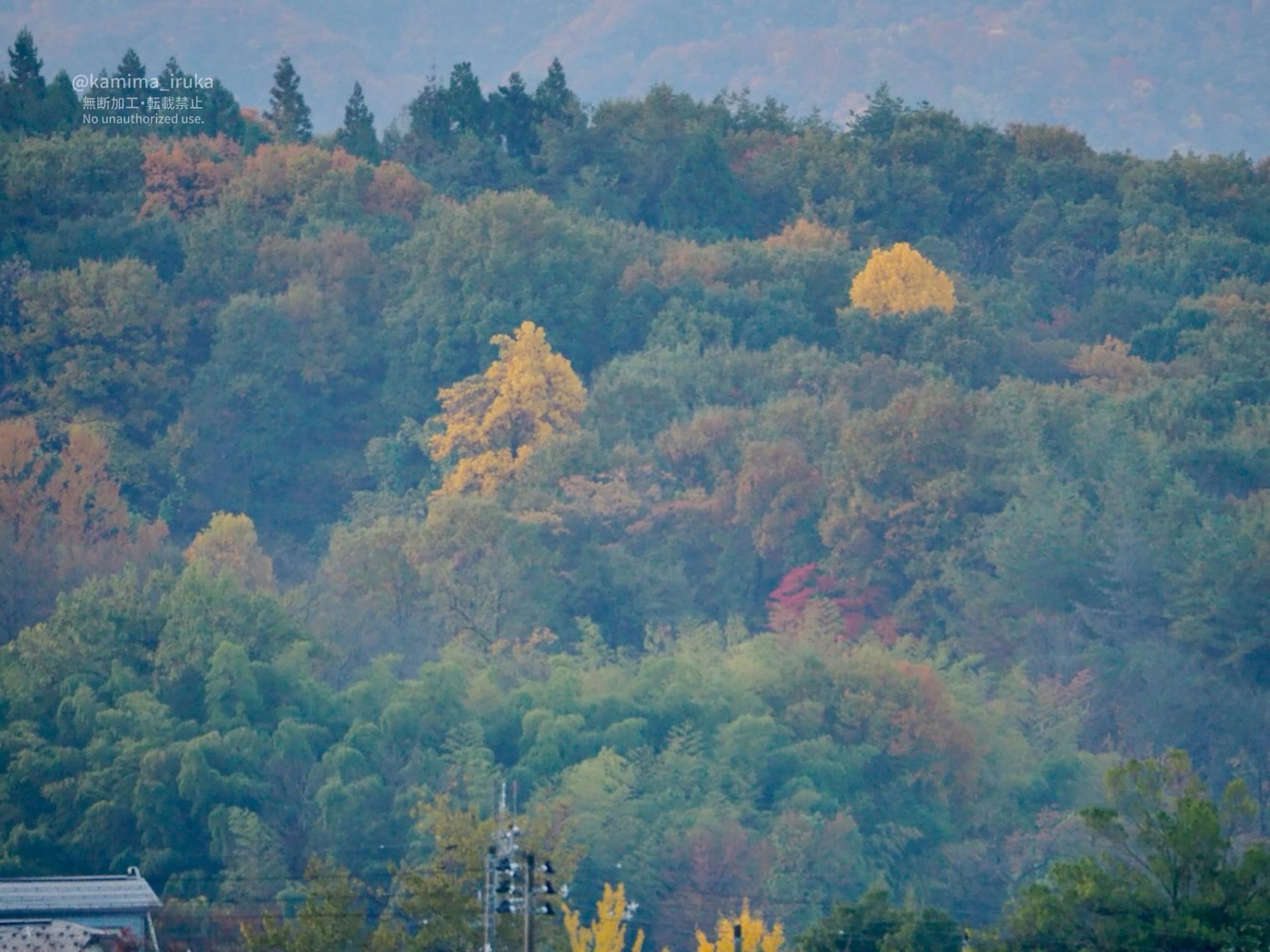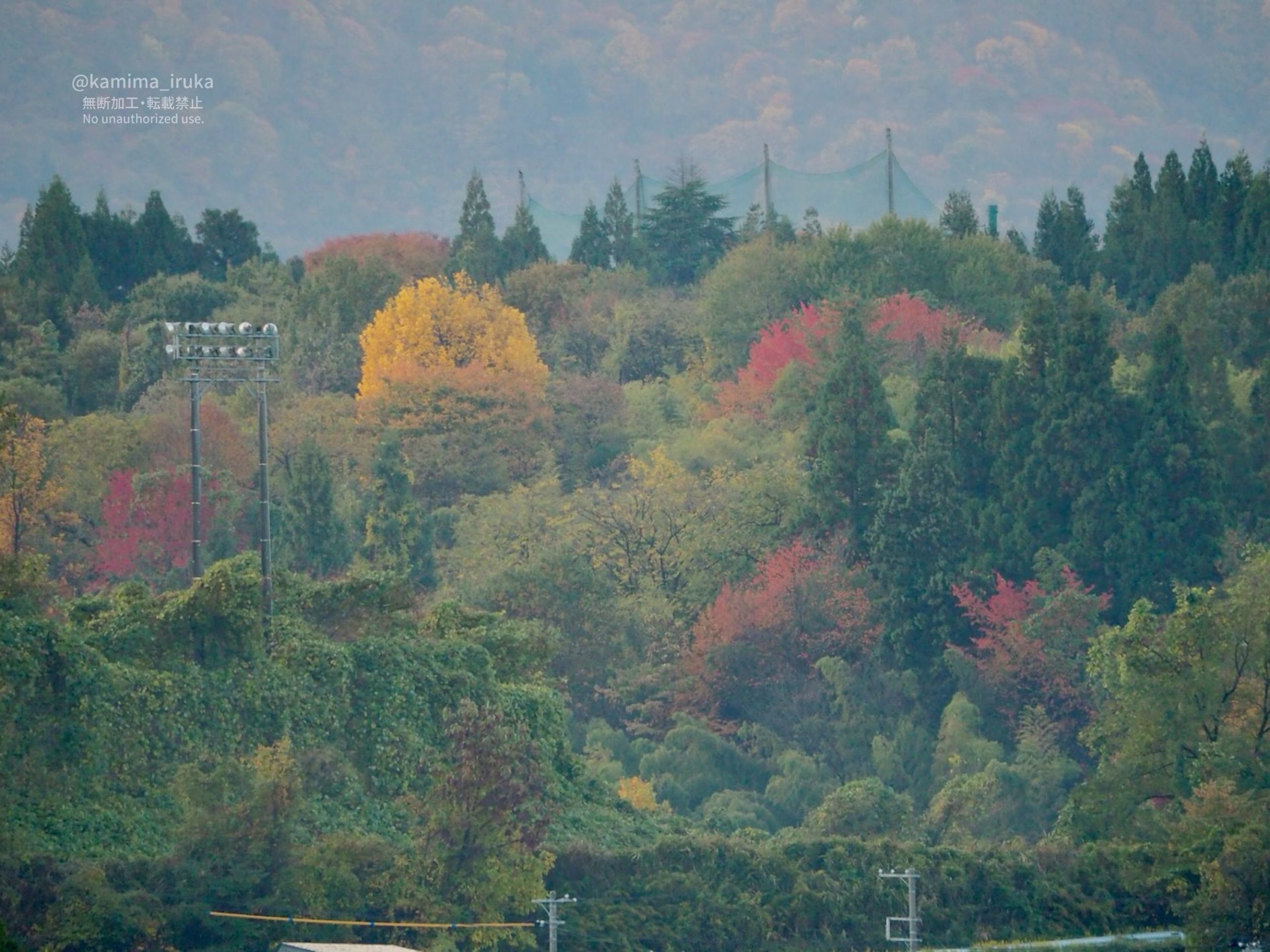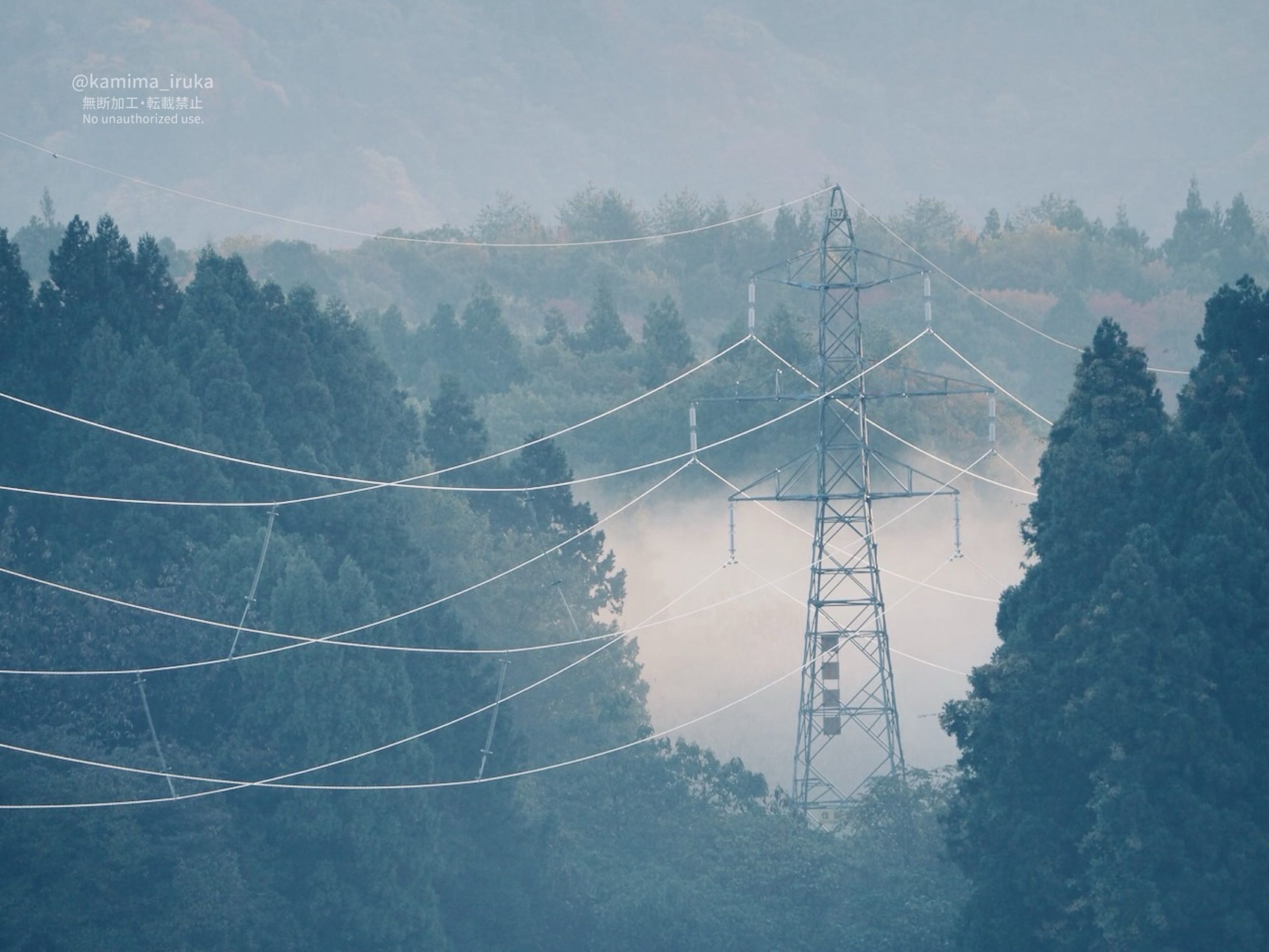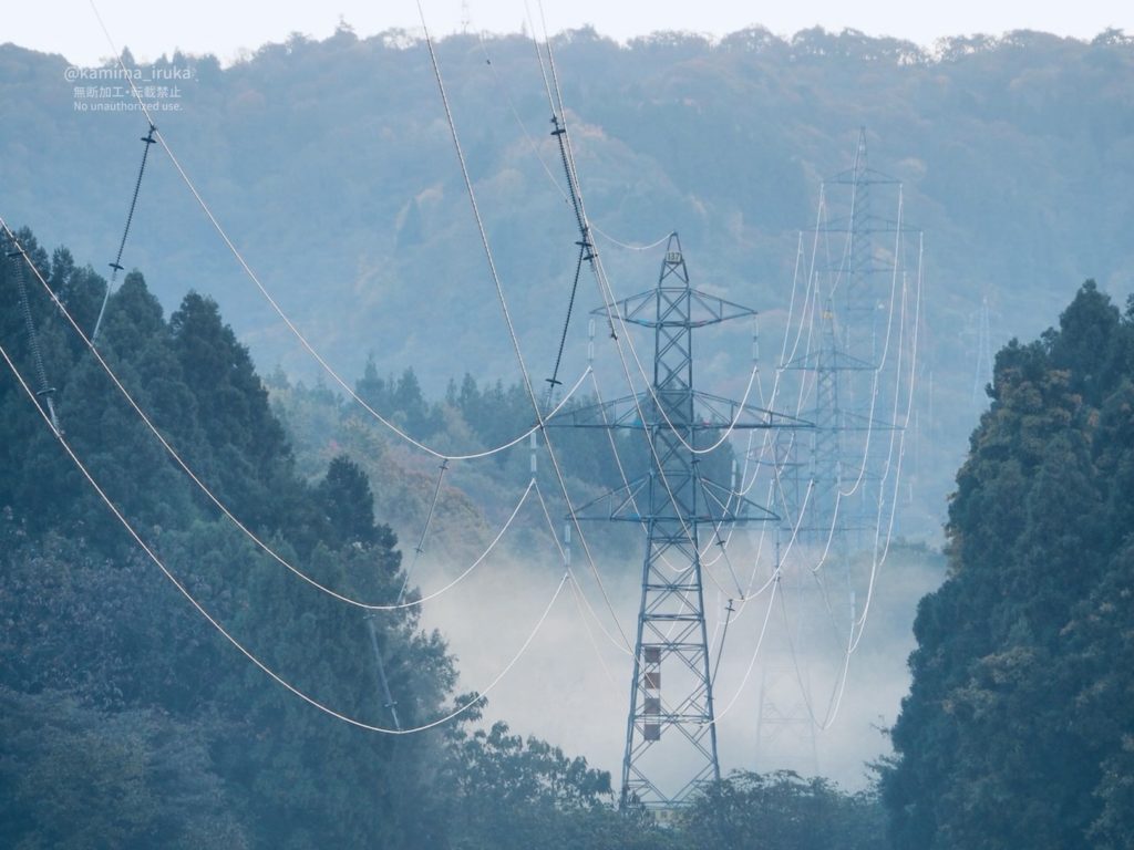 朝靄にしずむ送電塔。山々はだいぶ紅葉してきました。