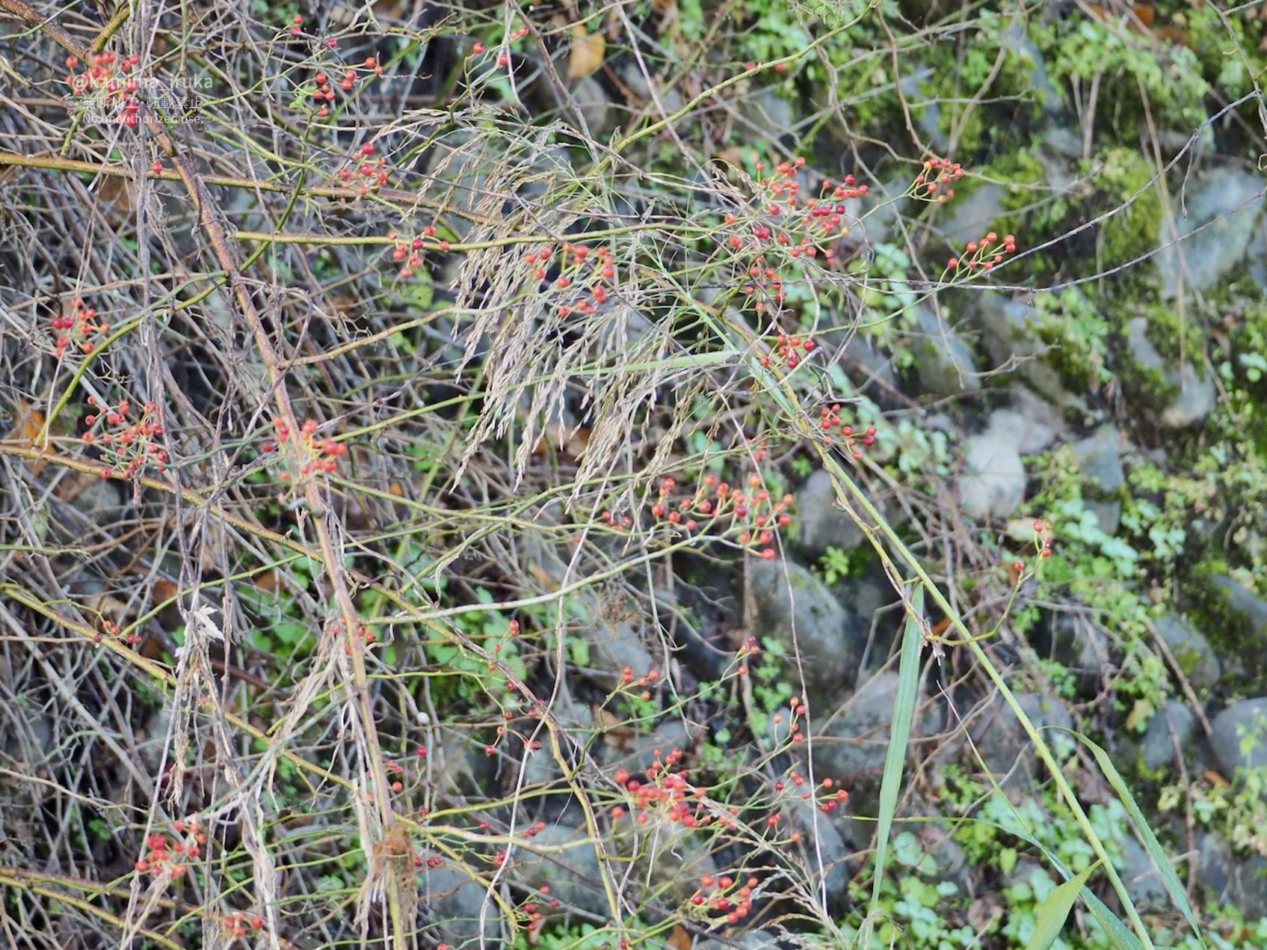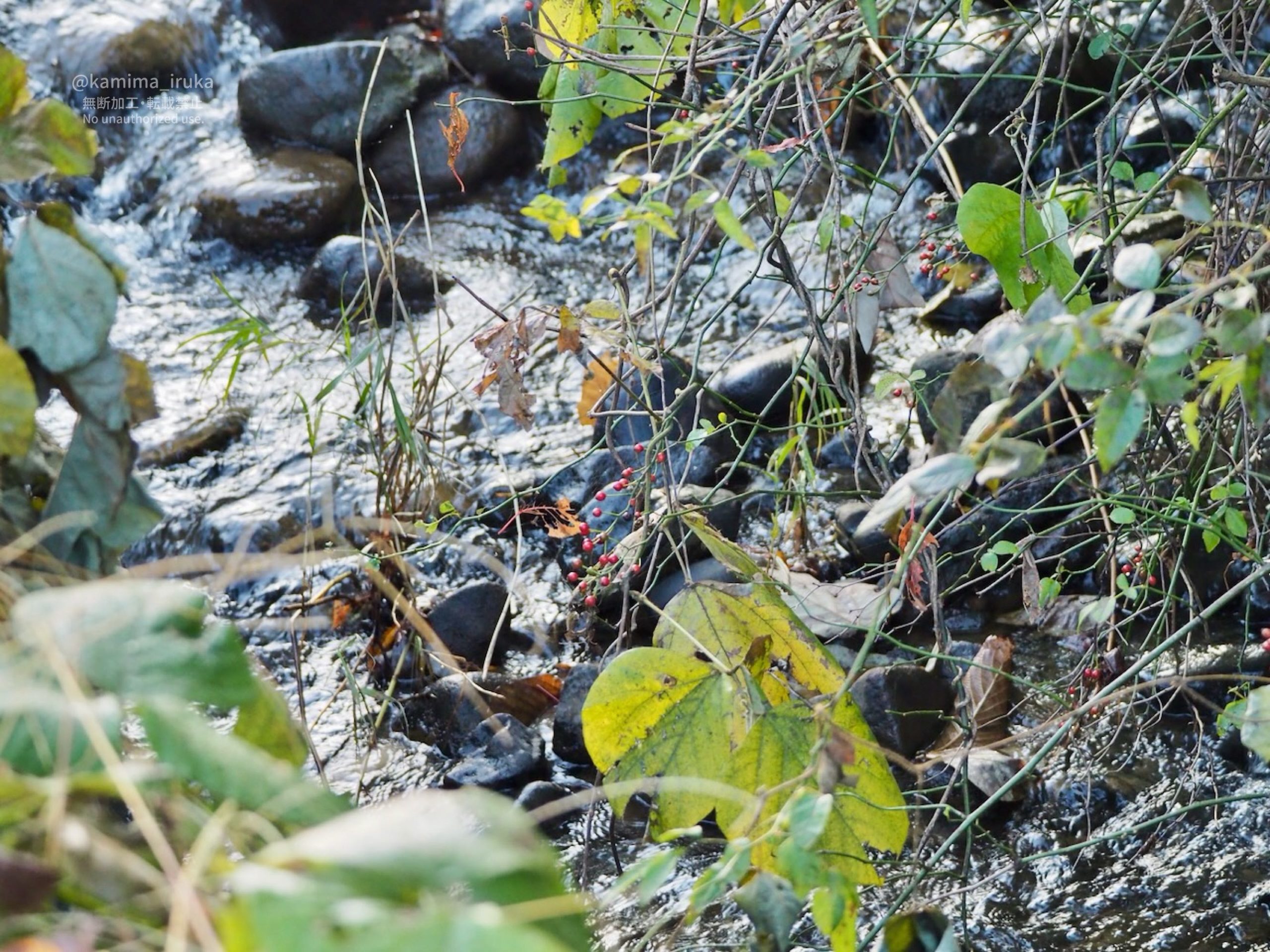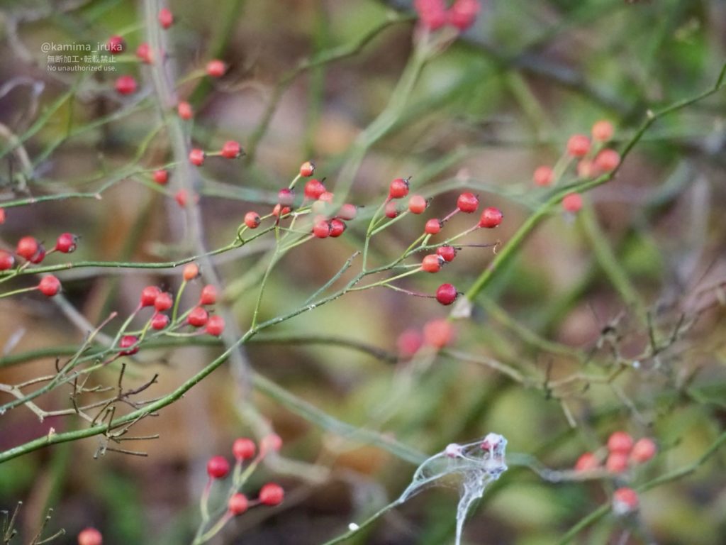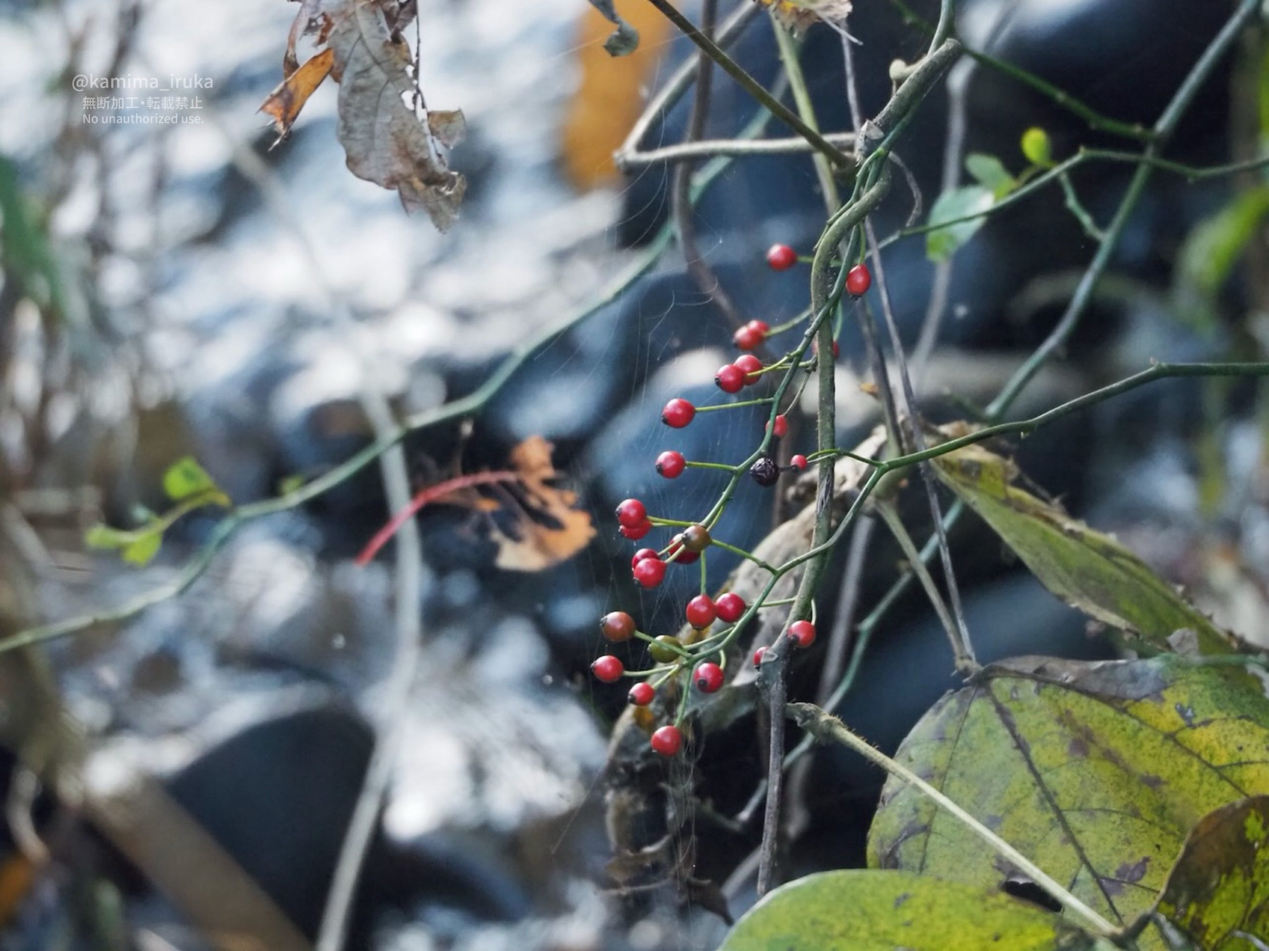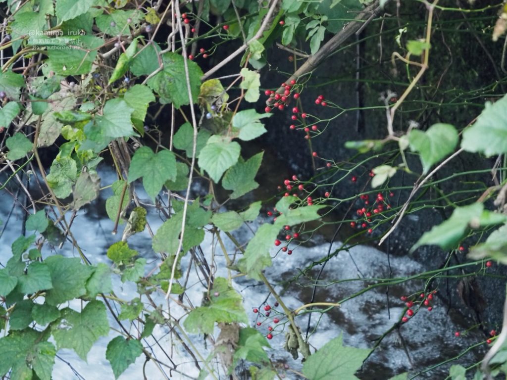 水路沿いにポチポチと、赤くてまるい小さな実。ノイバラかなあ…?