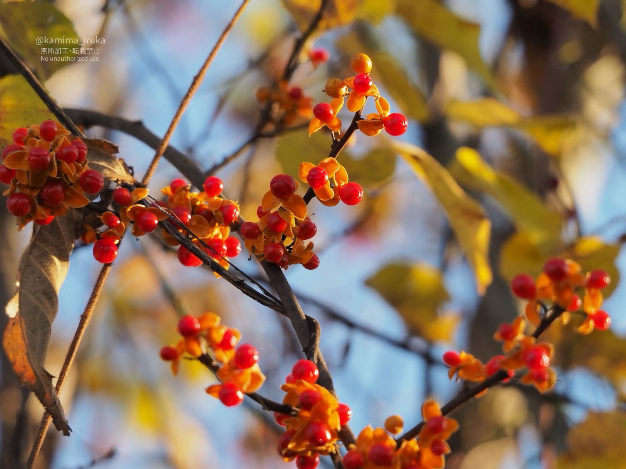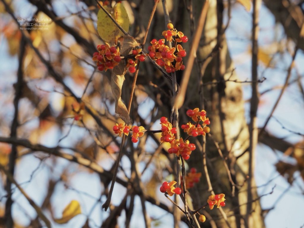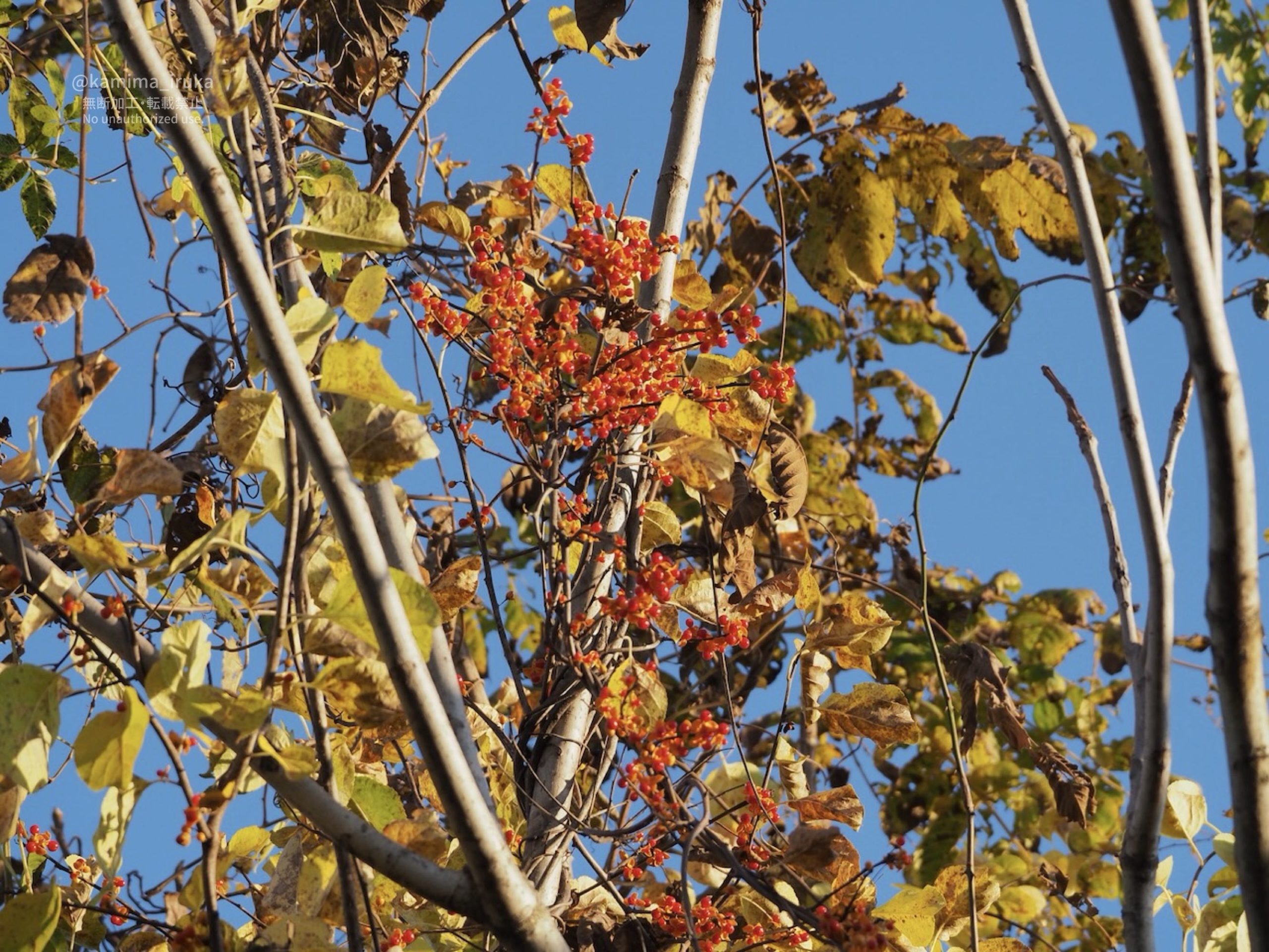 木本体に実が付いているというよりは、絡みついたツルから花が咲き、そこに実がなった様子。どうやらツルウメモドキっぽいです。