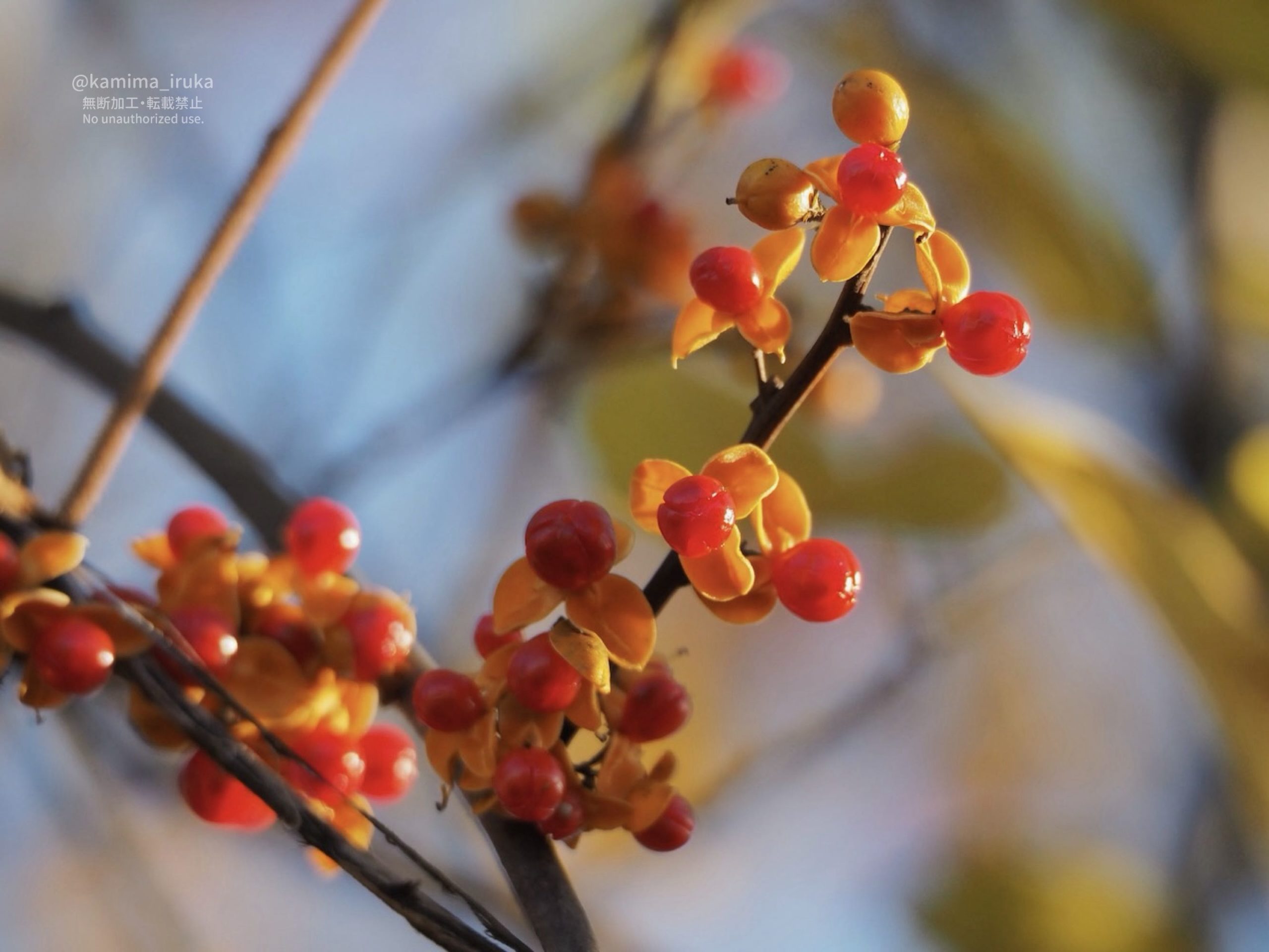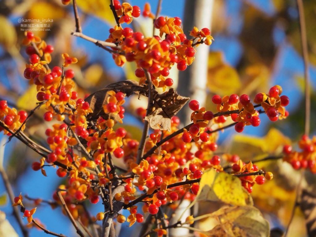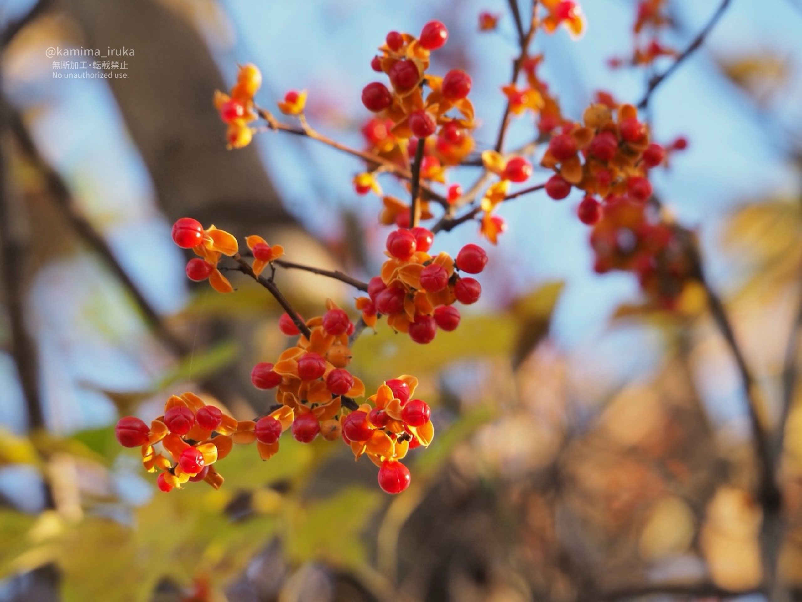 木本体に実が付いているというよりは、絡みついたツルから花が咲き、そこに実がなった様子。どうやらツルウメモドキっぽいです。