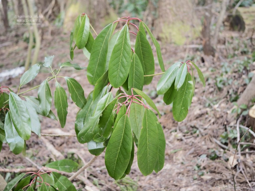 葉の緑と葉柄の紅、鮮やかなコントラストが目をひくユズリハ。常緑樹は強いですねえ〜